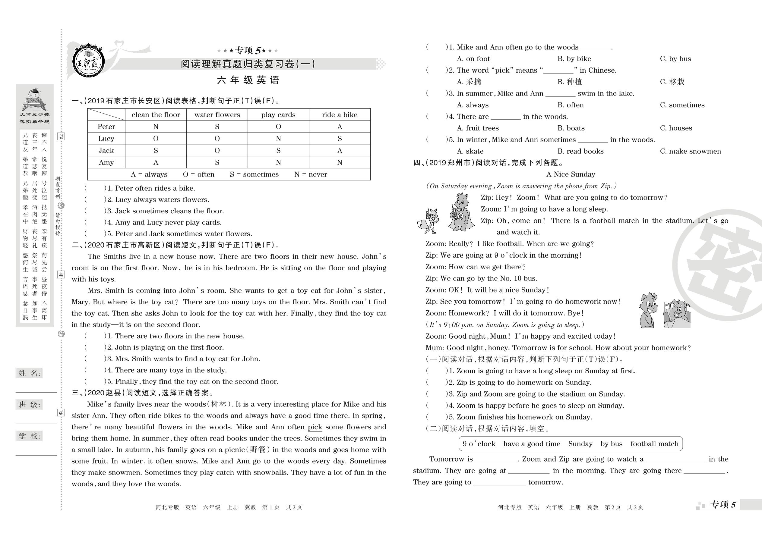 王朝霞期末专项卷——阅读理解真题归类复习六年级上册英语(冀教版)【0】