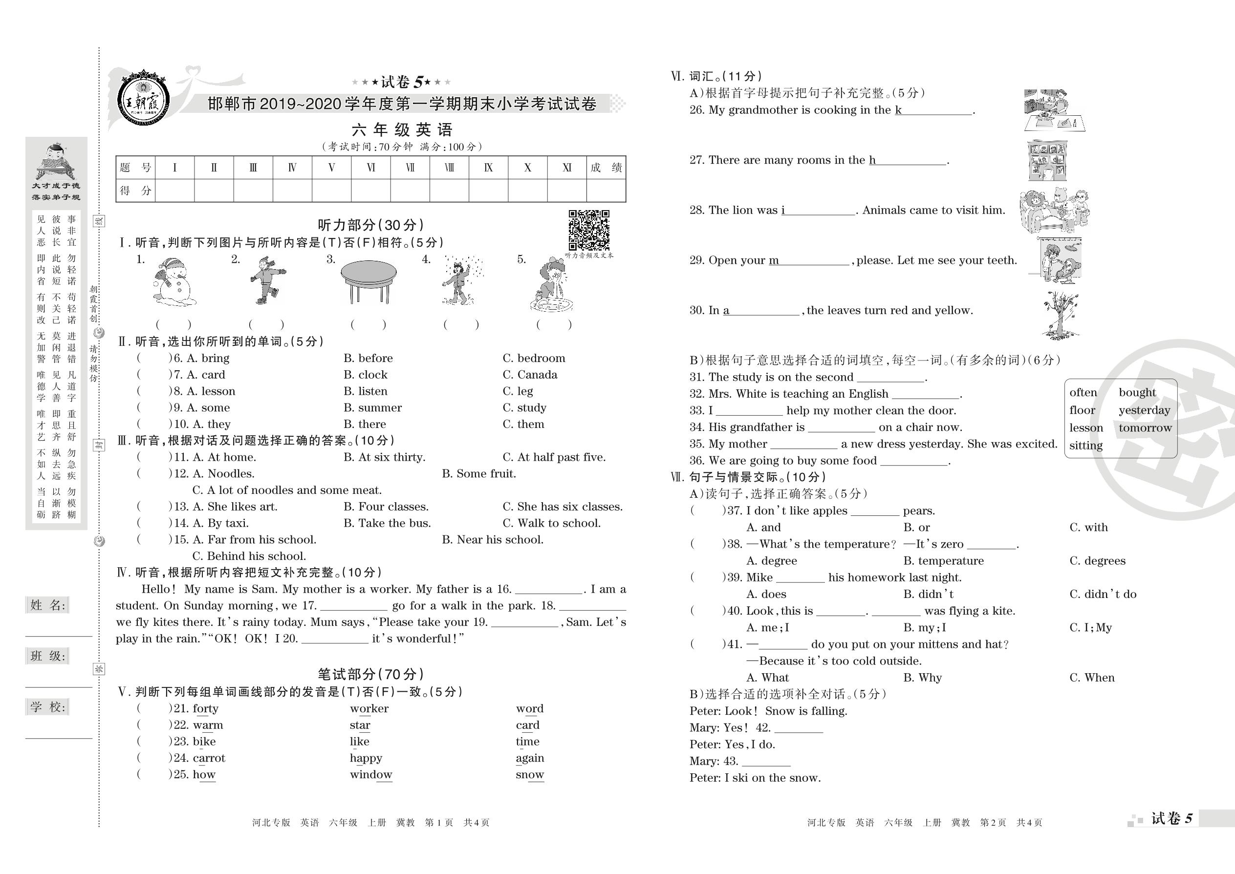 2019-2020学年第一学期邯郸市六年级英语试卷(冀教版)【5】