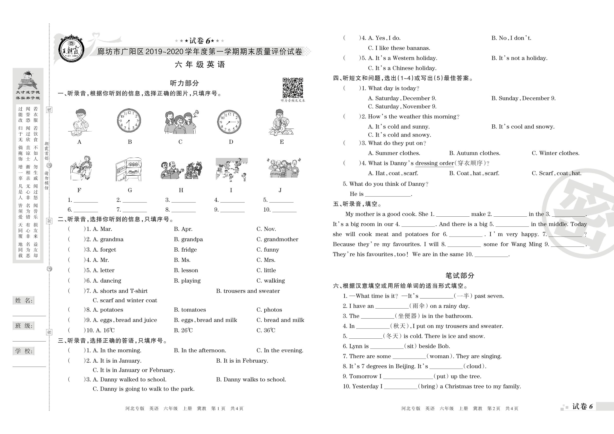 2019-2020学年第一学期廊坊市广阳区六年级英语试卷(冀教版)【6】