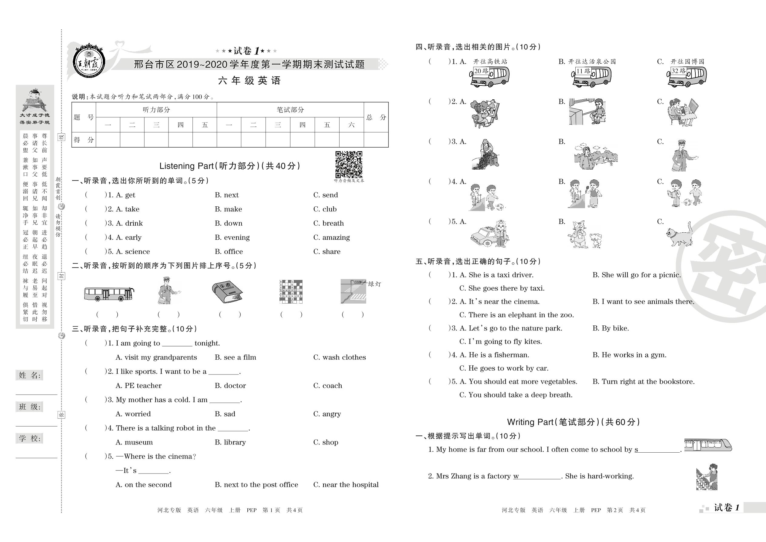2019-2020学年第一学期邢台市区六年级英语试卷(PEP版)【1】