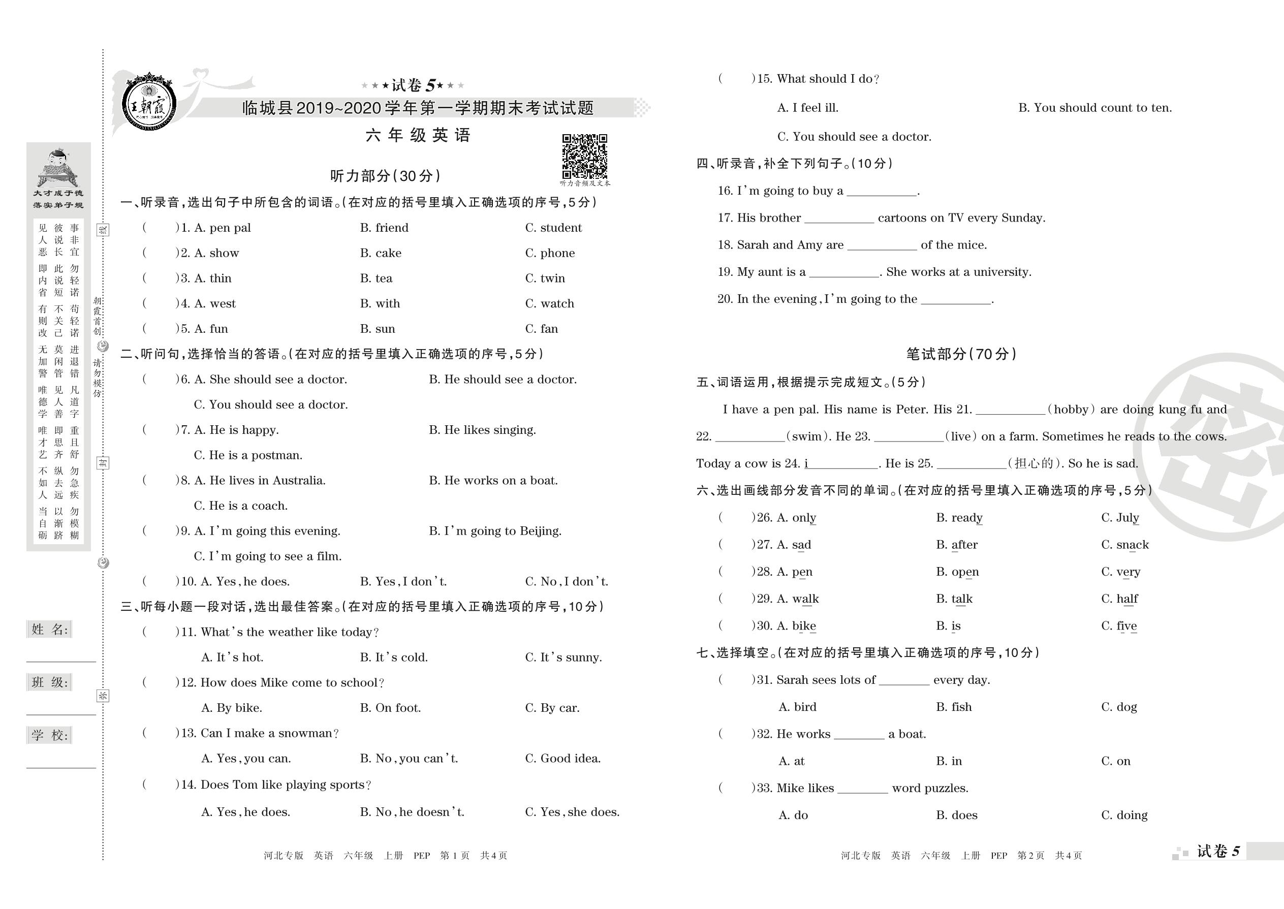 2019-2020学年第一学期邢台市临城县六年级英语试卷(PEP版)【5】