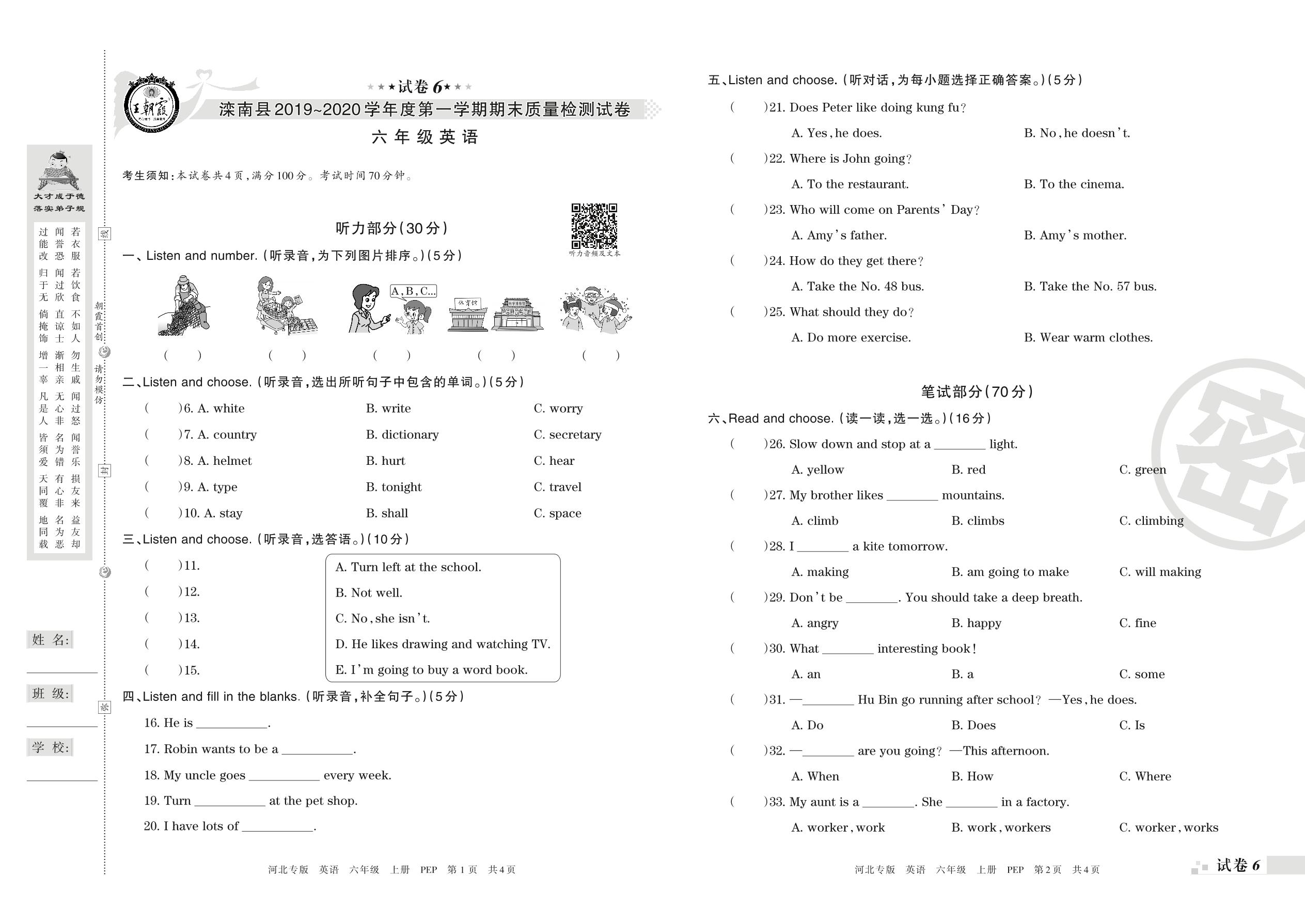 2019-2020学年第一学期唐山市滦南县六年级英语试卷(PEP版)【6】
