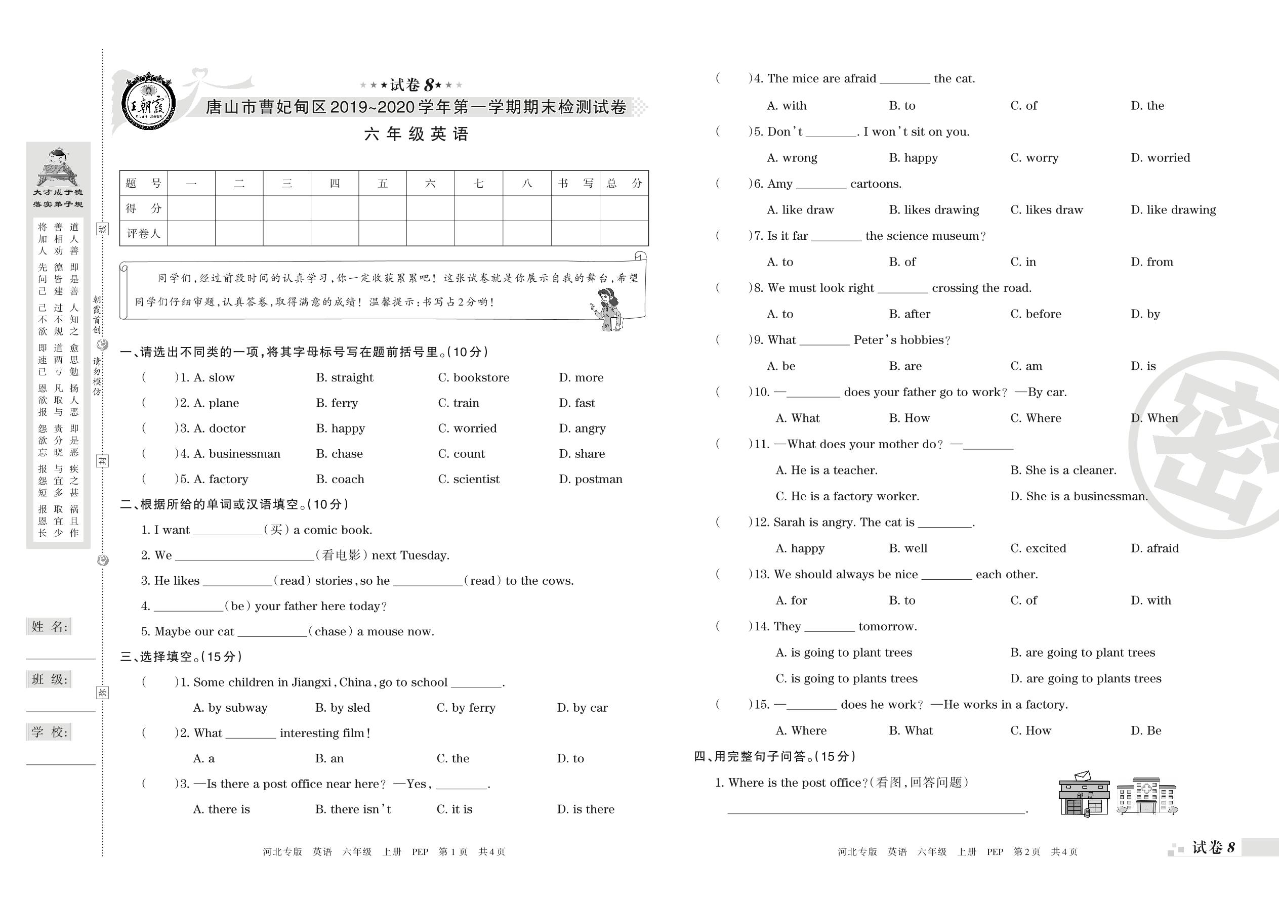 2019-2020学年第一学期唐山市曹妃甸区六年级英语试卷(PEP版)【8】