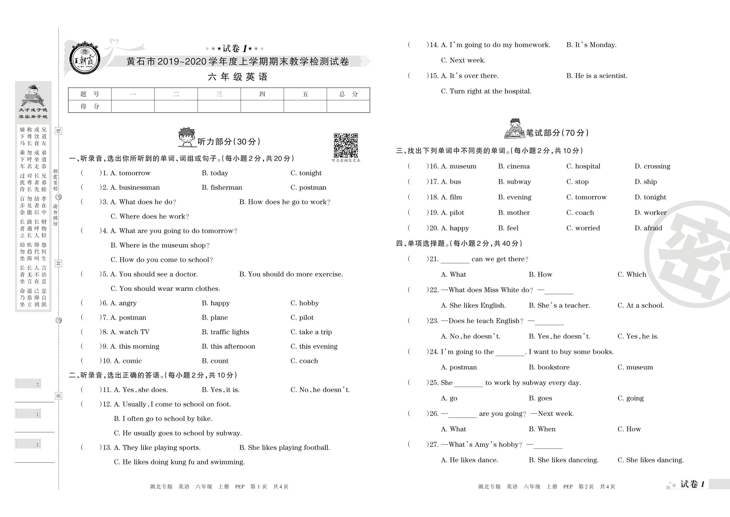2019-2020学年第一学期黄石市六年级英语试卷(PEP版)【1】