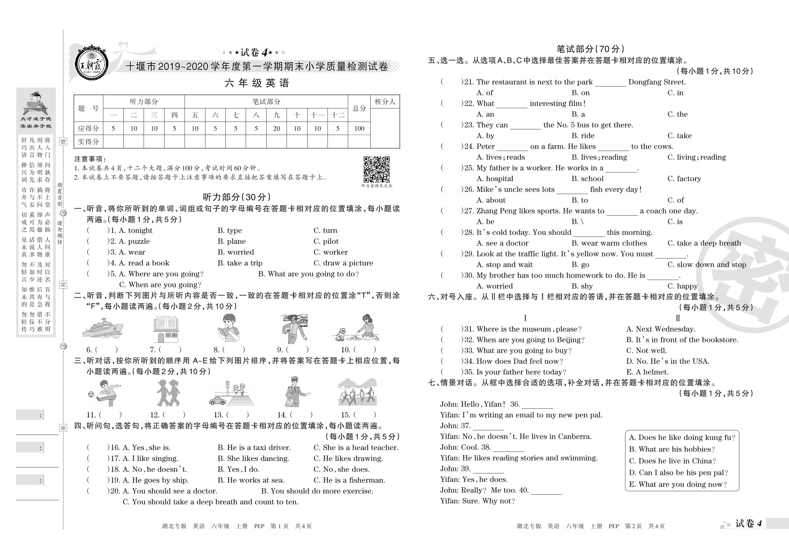 2019-2020学年第一学期十堰市六年级英语试卷(PEP版)【4】