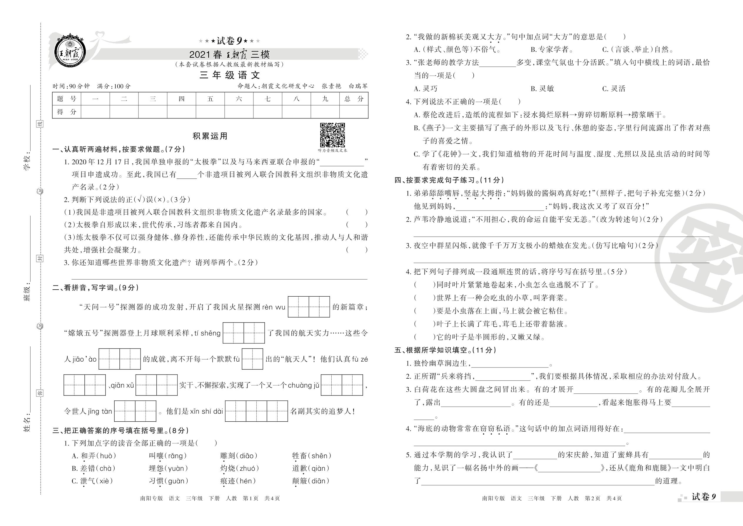 王朝霞期末模拟卷三年级下册语文(人教版)_R21080183833【9】
