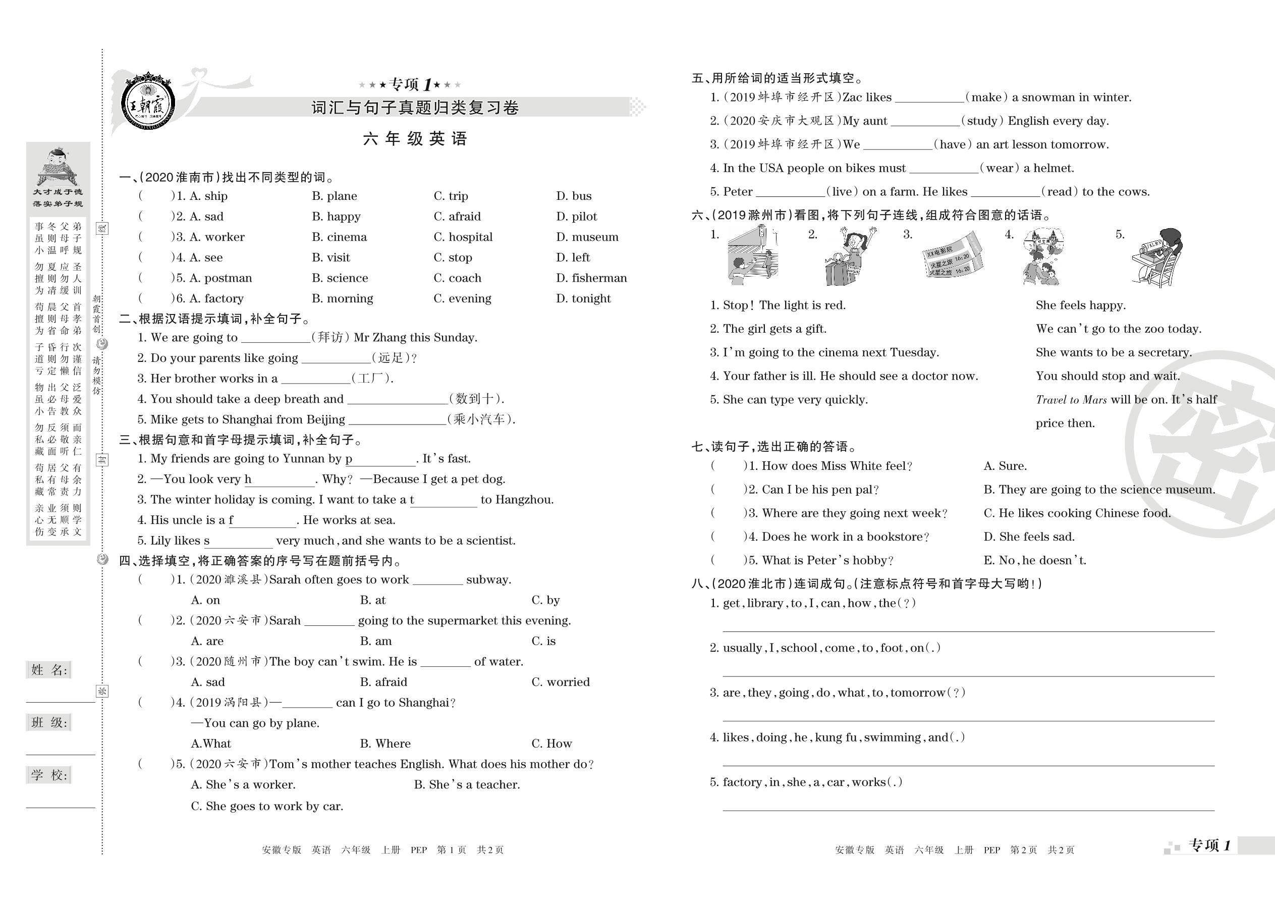 王朝霞期末专项卷——词汇与句子、补全短文与阅读理解真题归类复习六年级上册英语(PEP版)