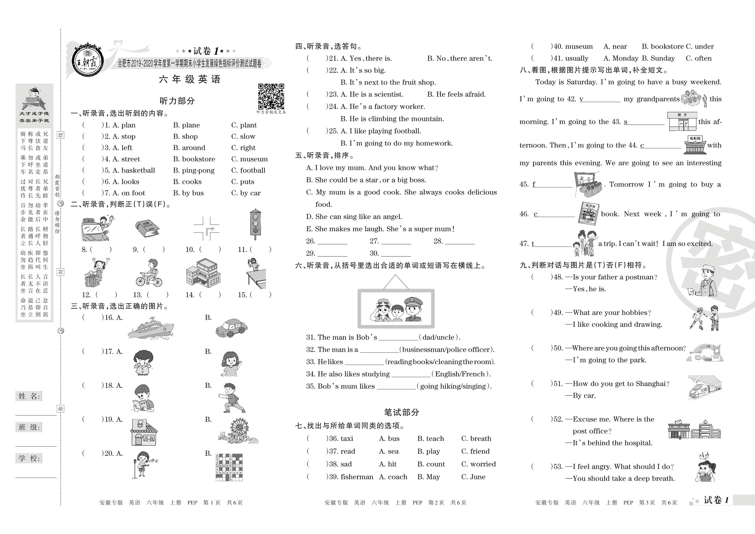 2019-2020学年第一学期合肥市六年级英语试卷(PEP版)【1】