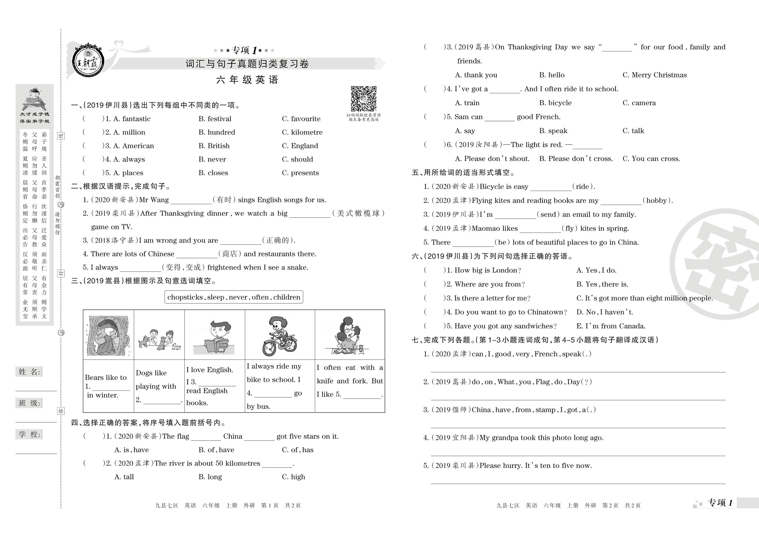 王朝霞期末专项卷——词汇与句子、补全短文与阅读理解真题归类复习六年级上册英语(外研版)【0】