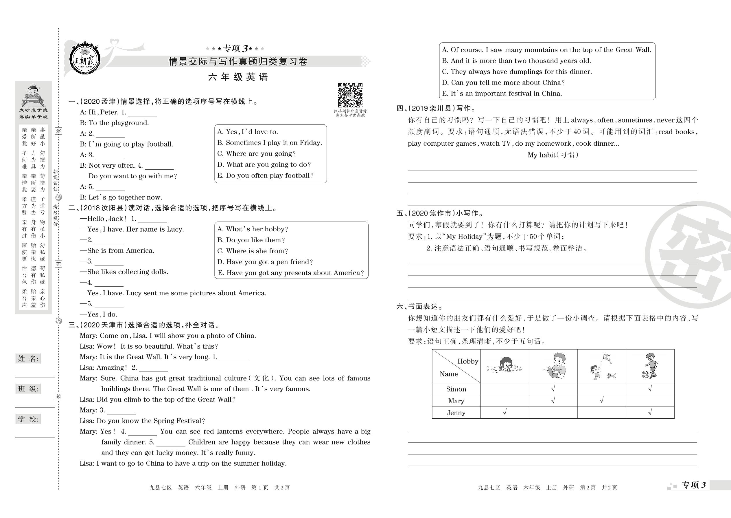 王朝霞期末专项卷——情景交际与写作真题归类复习、绘本阅读六年级上册英语(外研版)【0】