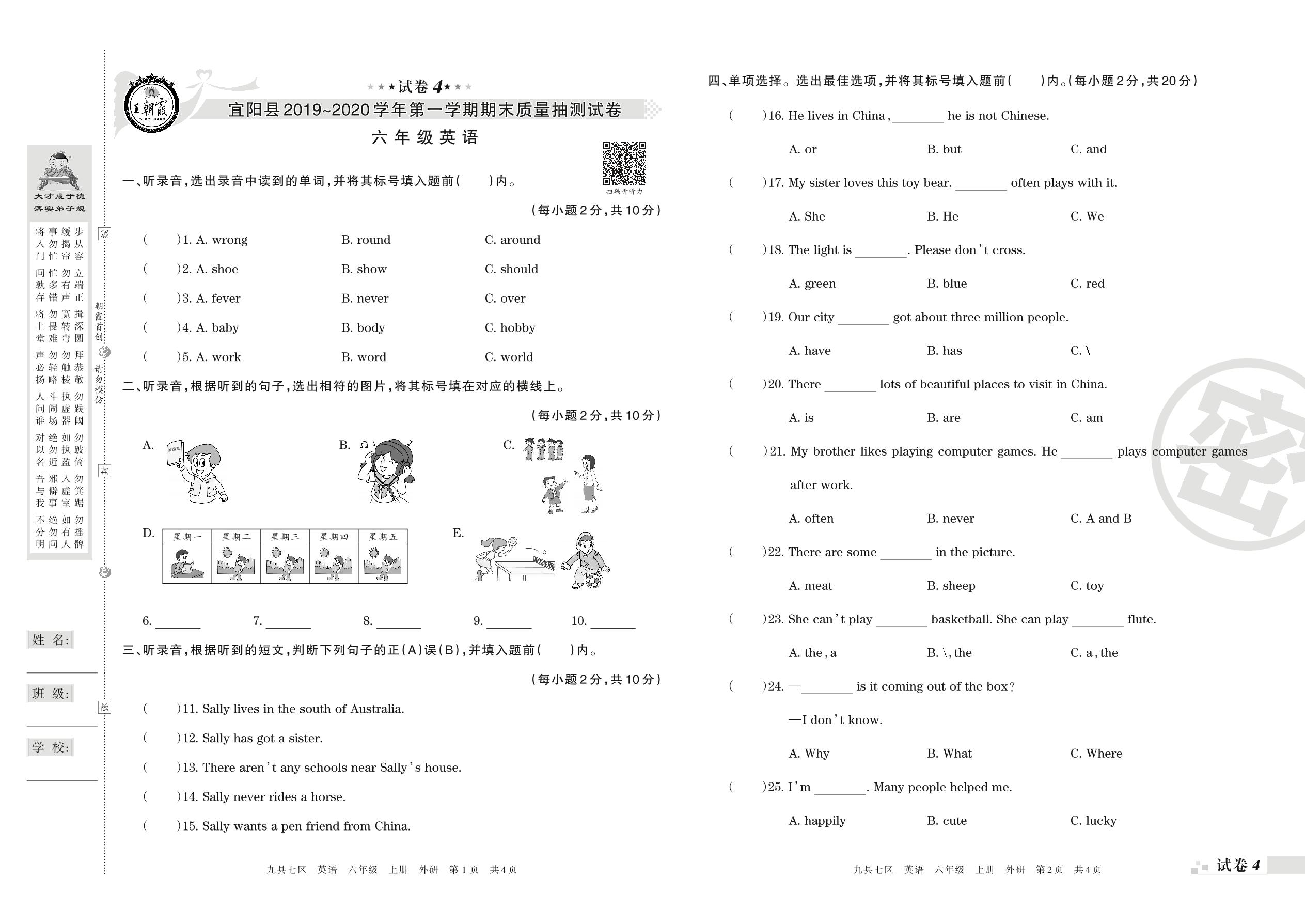 2019-2020学年第一学期洛阳市宜阳县六年级英语试卷(外研版)【4】