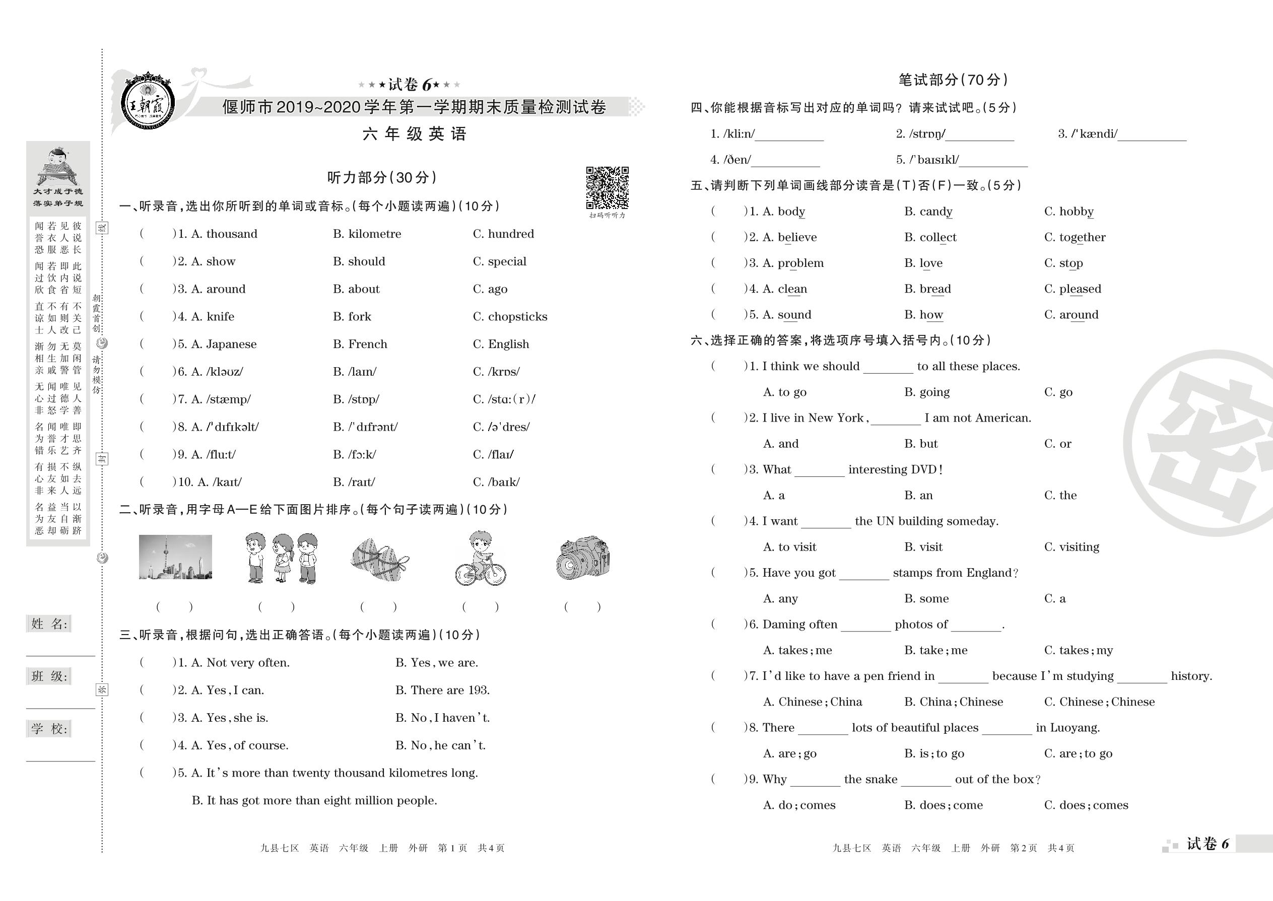 2019-2020学年第一学期偃师市六年级英语试卷(外研版)【6】