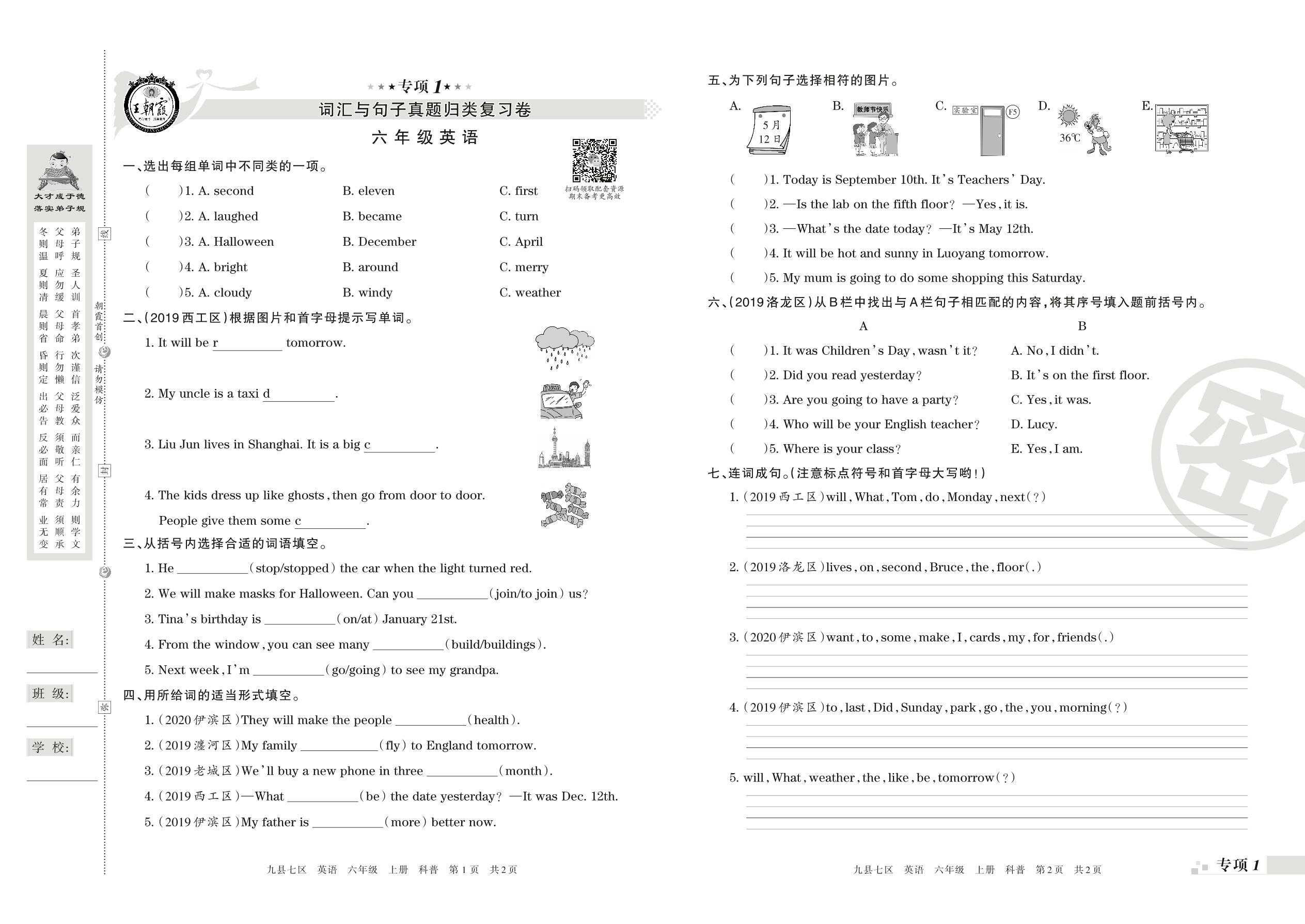 王朝霞期末专项卷——词汇与句子、补全短文与阅读理解真题归类复习六年级上册英语(科普版)【0】