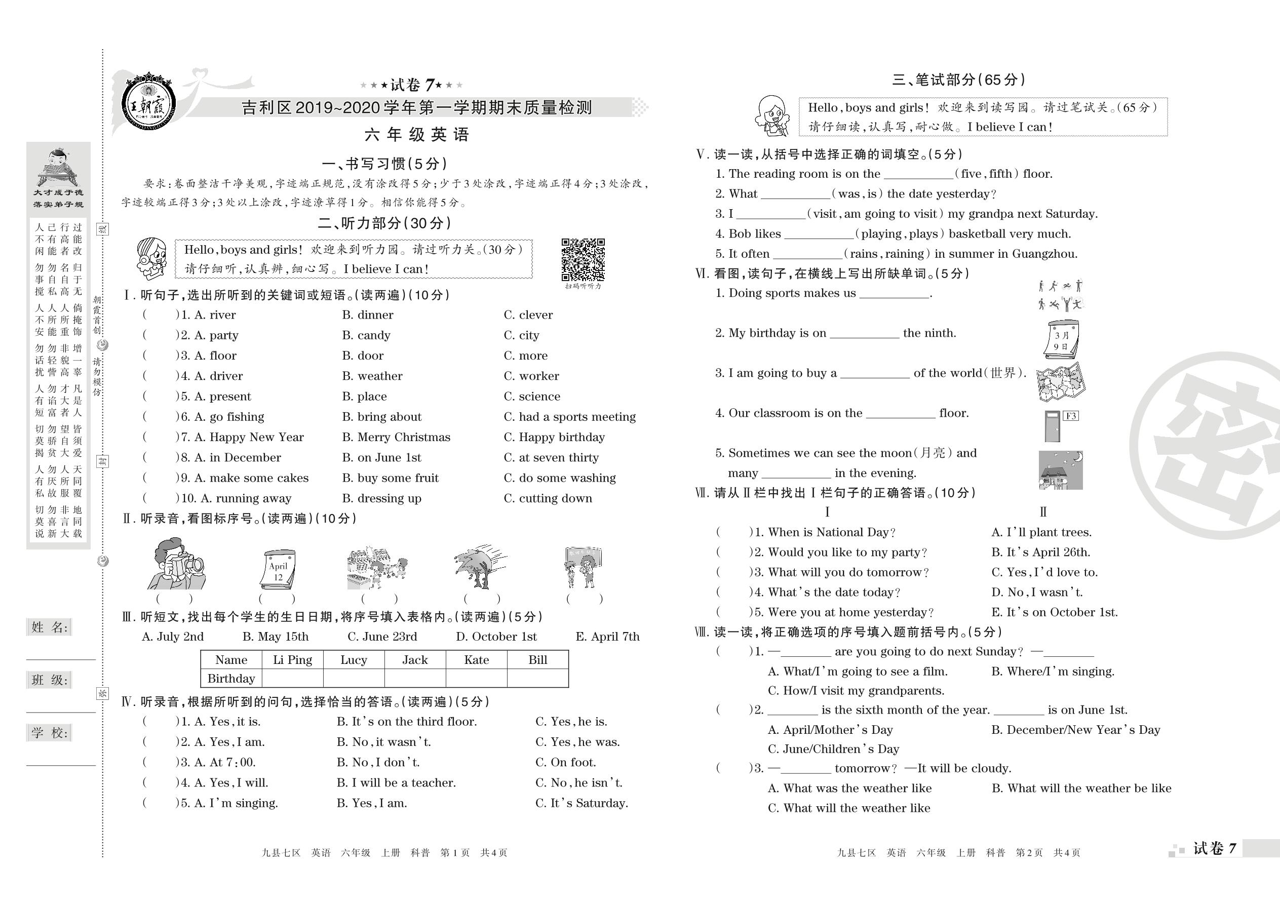 2019-2020学年第一学期洛阳市吉利区六年级英语试卷(科普版)【7】