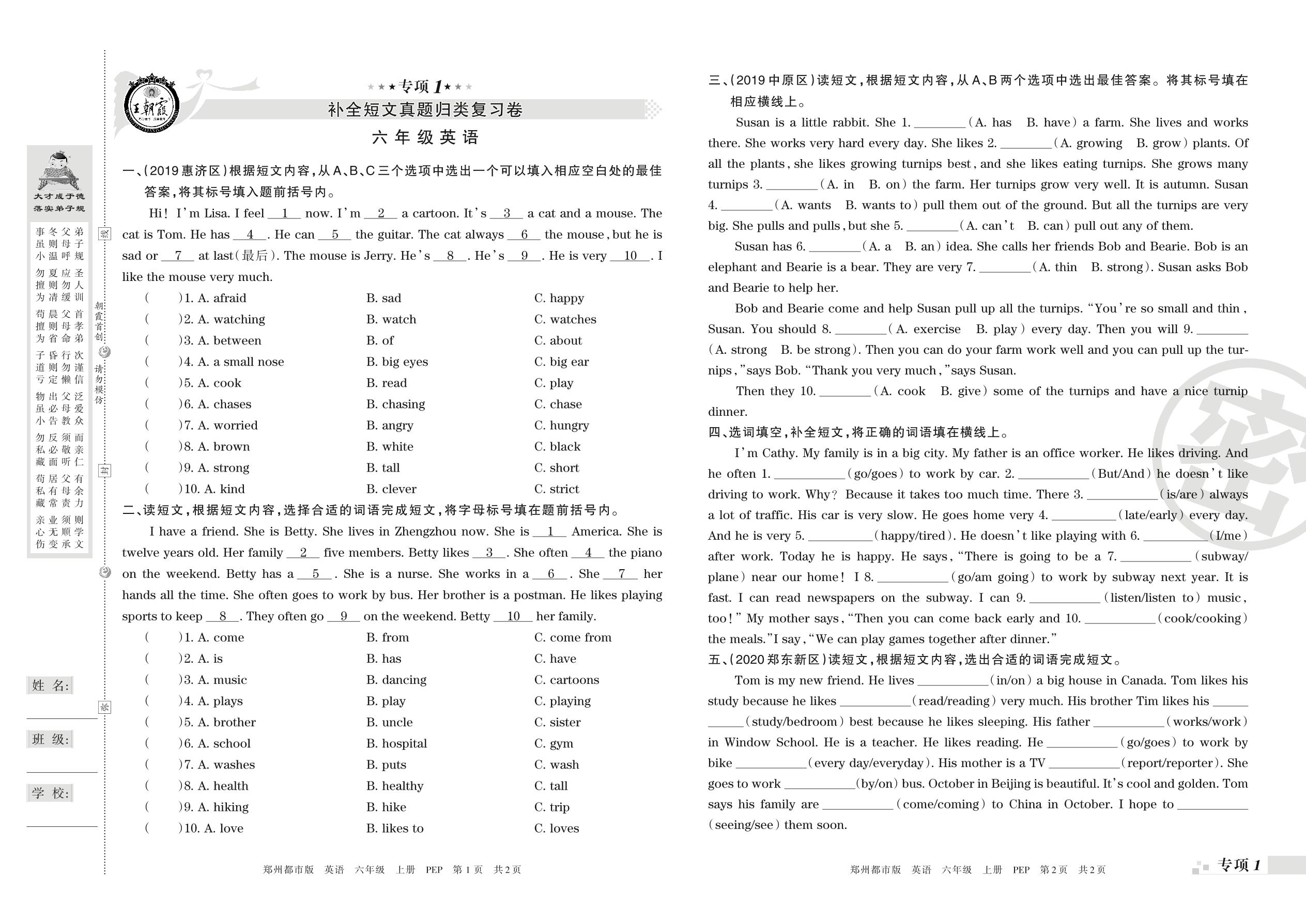王朝霞期末专项卷——补全短文、阅读理解真题归类复习六年级上册英语(PEP版)_R210807161906【0】