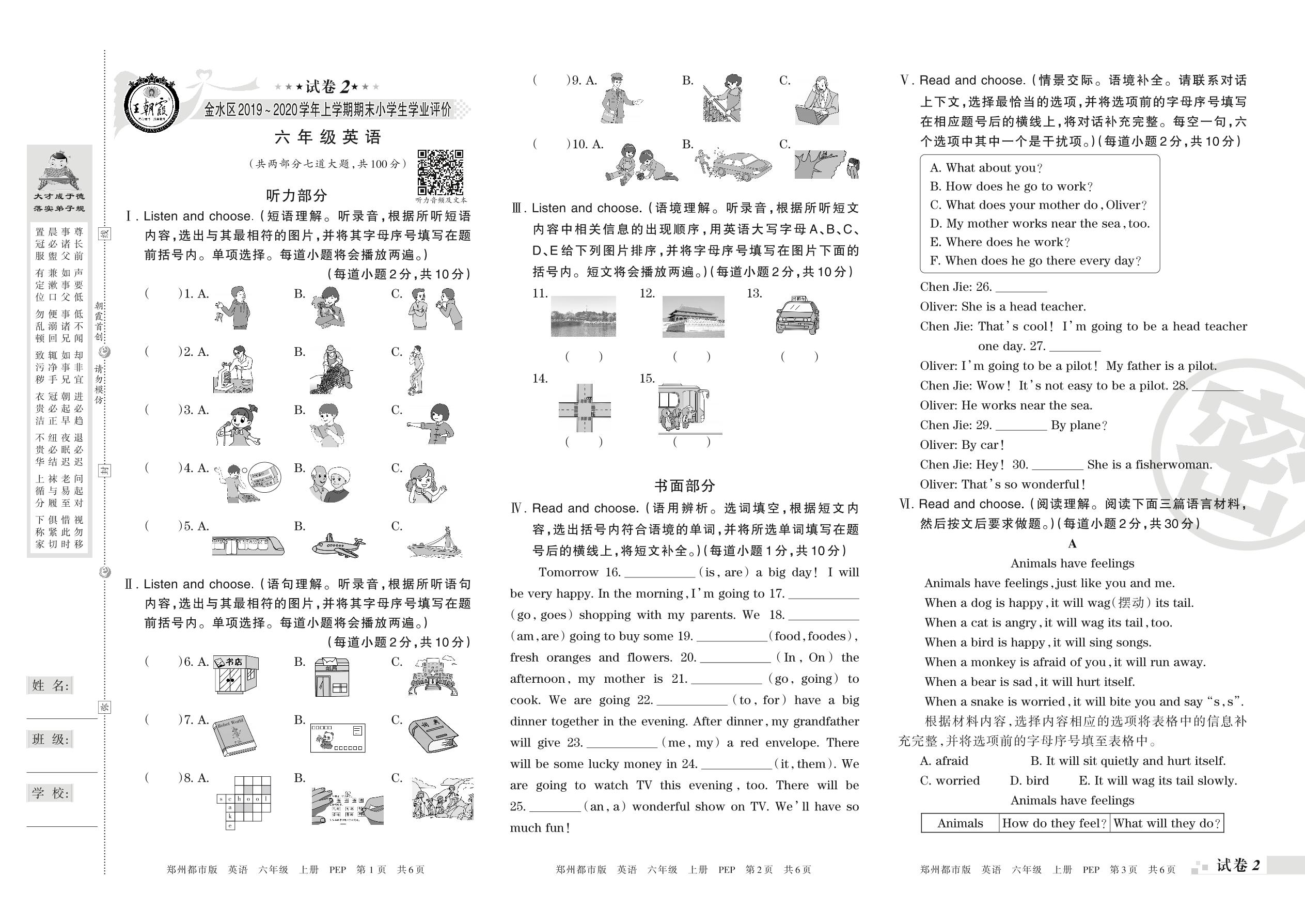 2019-2020学年第一学期郑州市金水区六年级英语试卷(PEP版)【2】