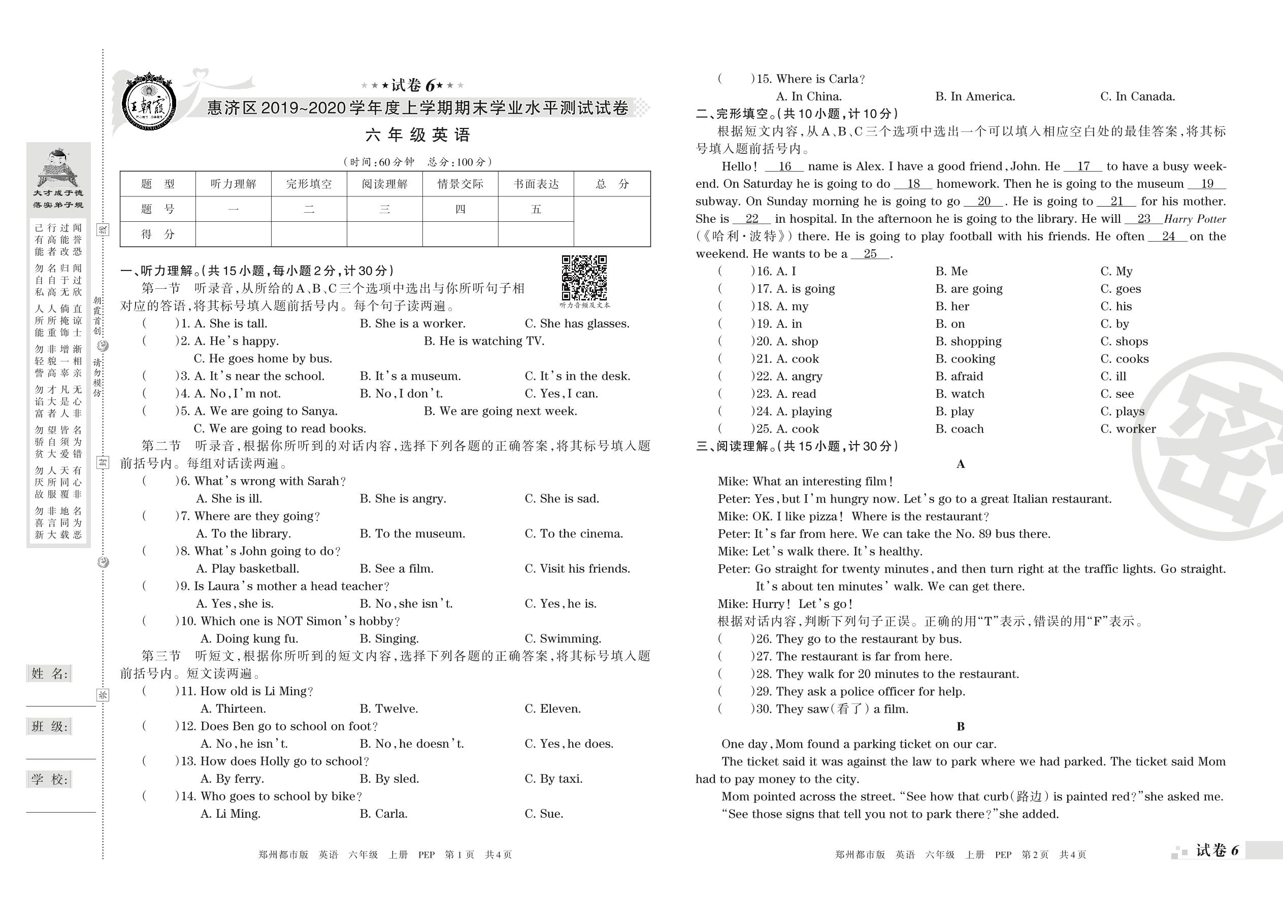 2019-2020学年第一学期郑州市惠济区六年级英语试卷(PEP版)【6】