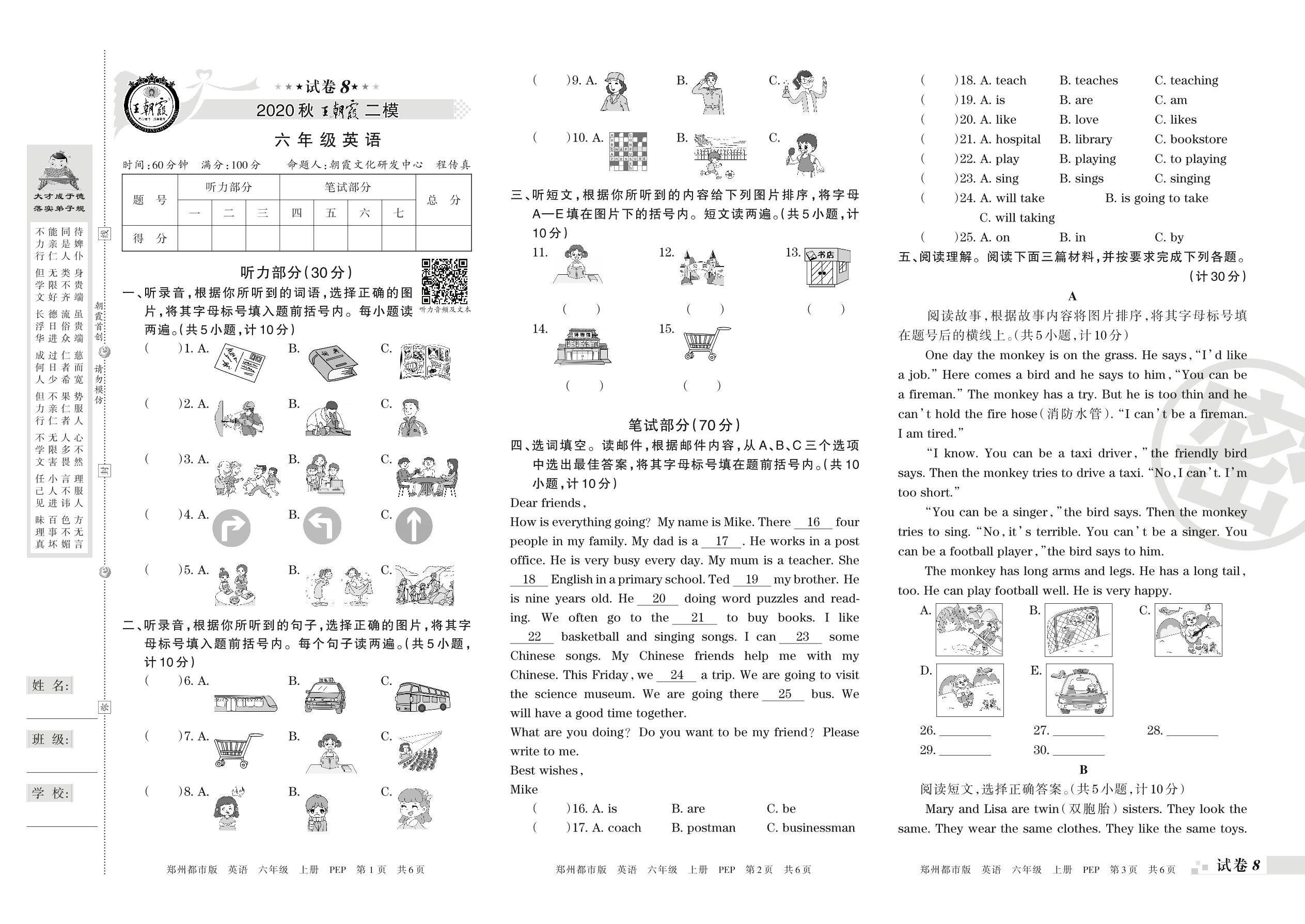 王朝霞期末模拟卷六年级上册英语(PEP版)_R210807162008【8】