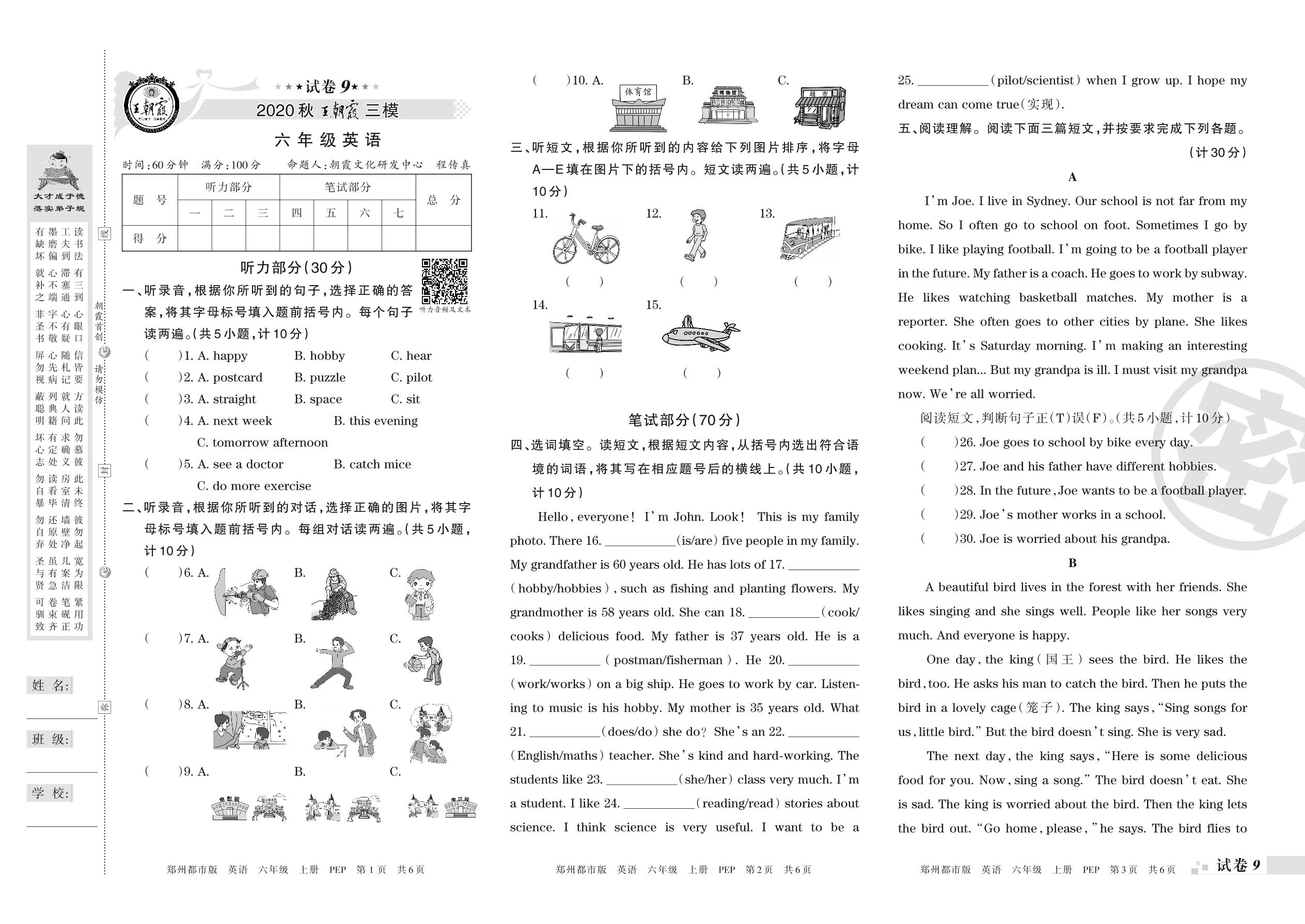 王朝霞期末模拟卷六年级上册英语(PEP版)_R210807162016【9】