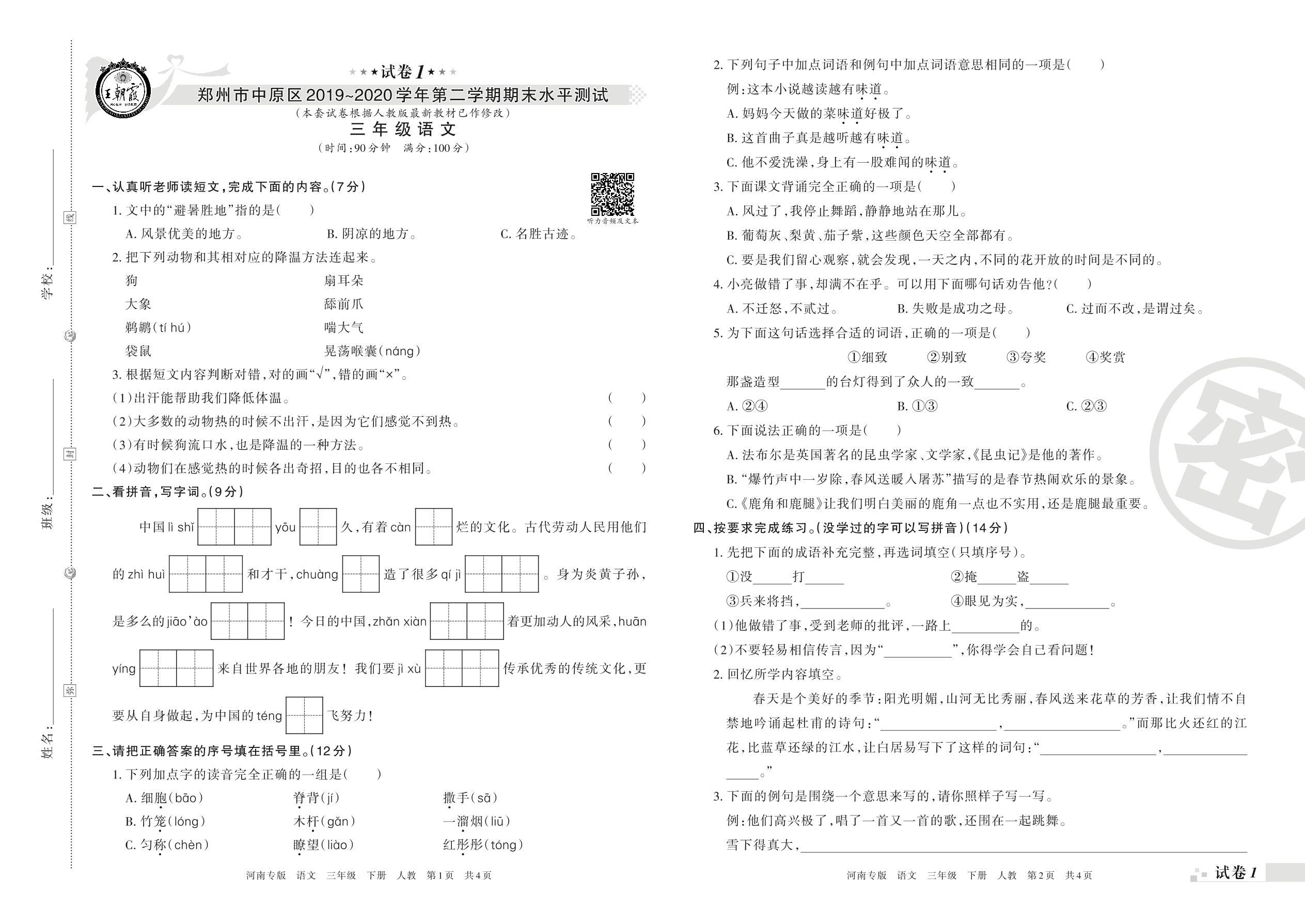2019-2020学年第二学期郑州市中原区三年级语文试卷(人教版)_R21080183903【1】
