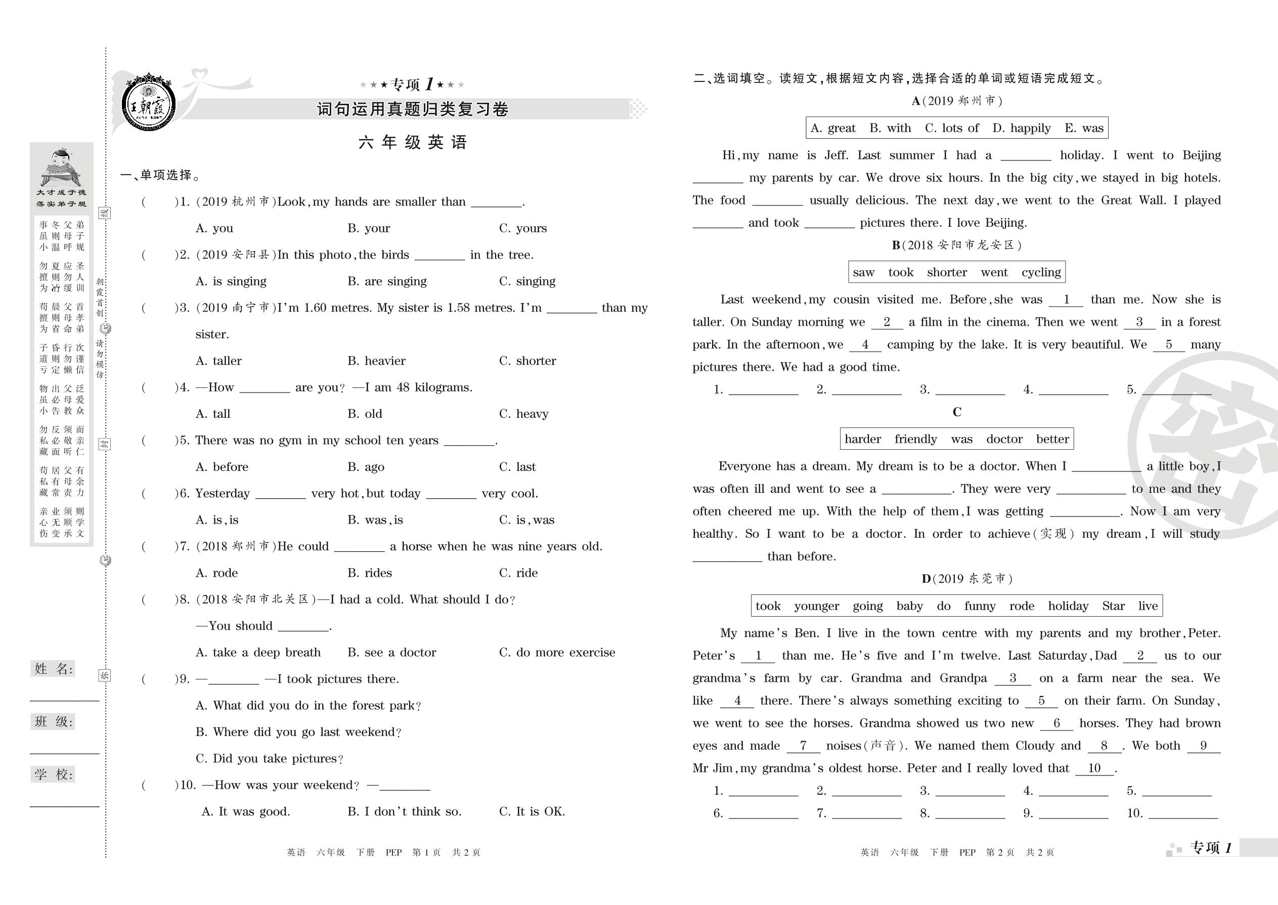 王朝霞期末专项卷——词句运用、汉译英真题归类复习卷六年级下册英语(PEP版)_R210807162030【0】