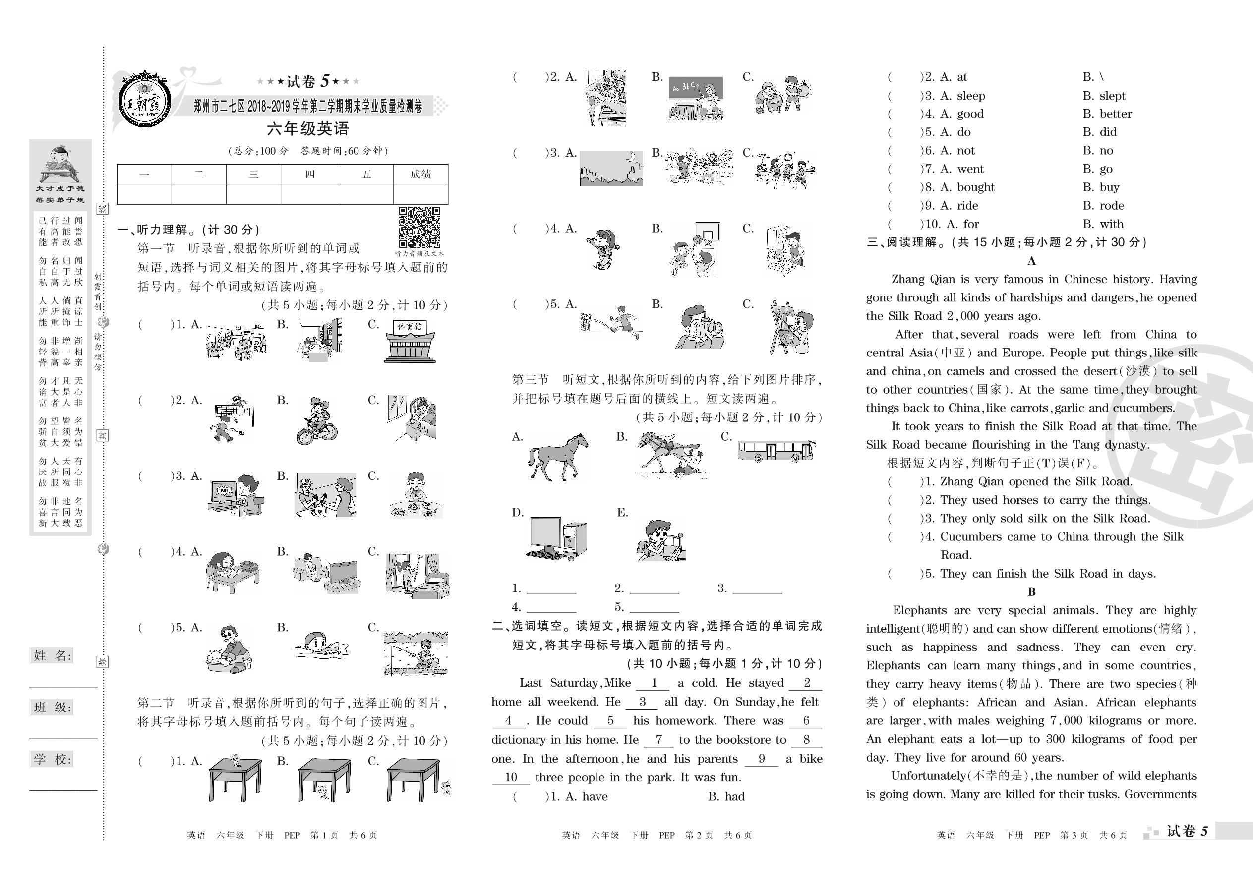 2018-2019学年第二学期郑州市二七区六年级英语试卷(PEP版)【5】