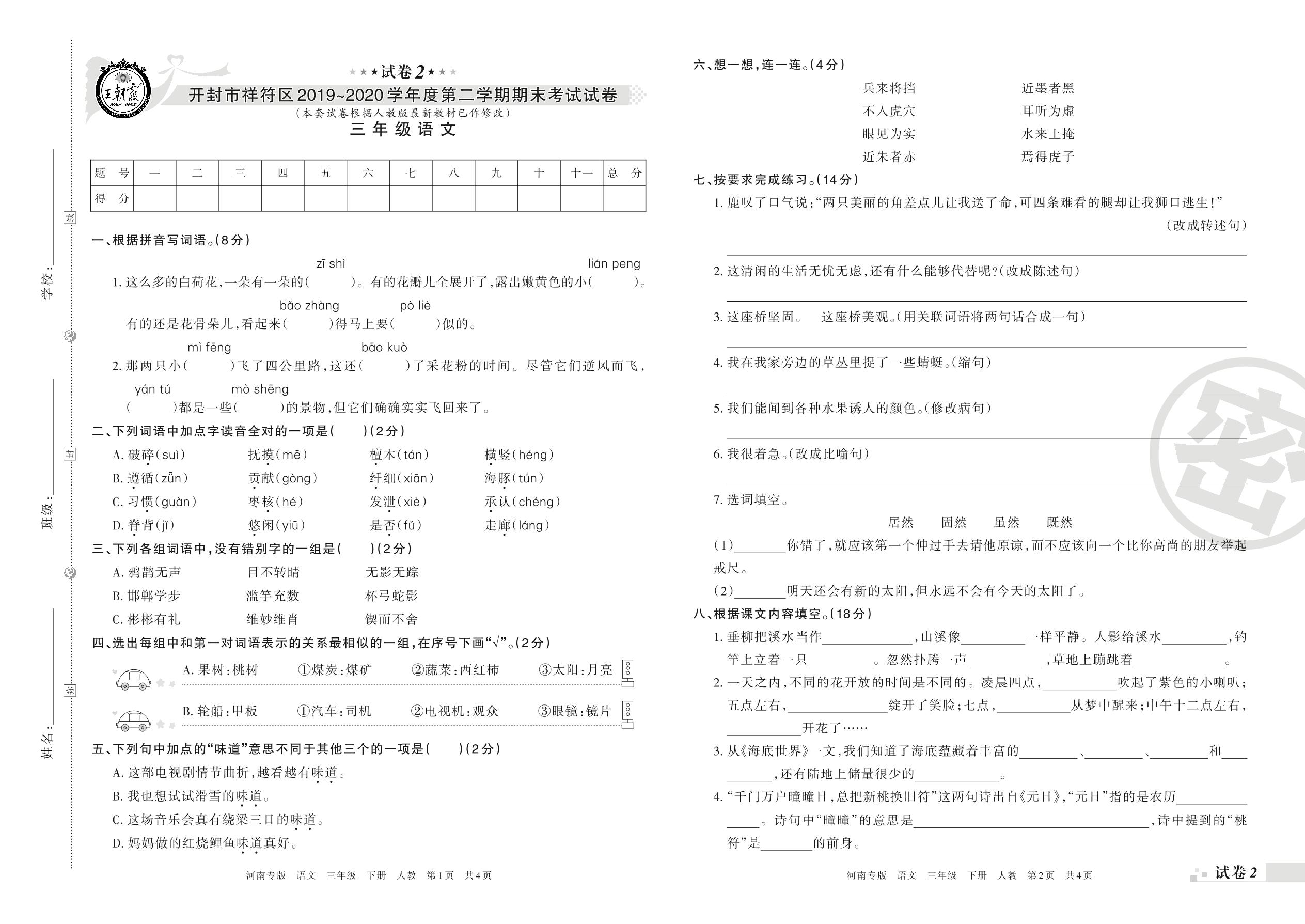 2019-2020学年第二学期开封市祥符区三年级语文试卷(人教版)【2】
