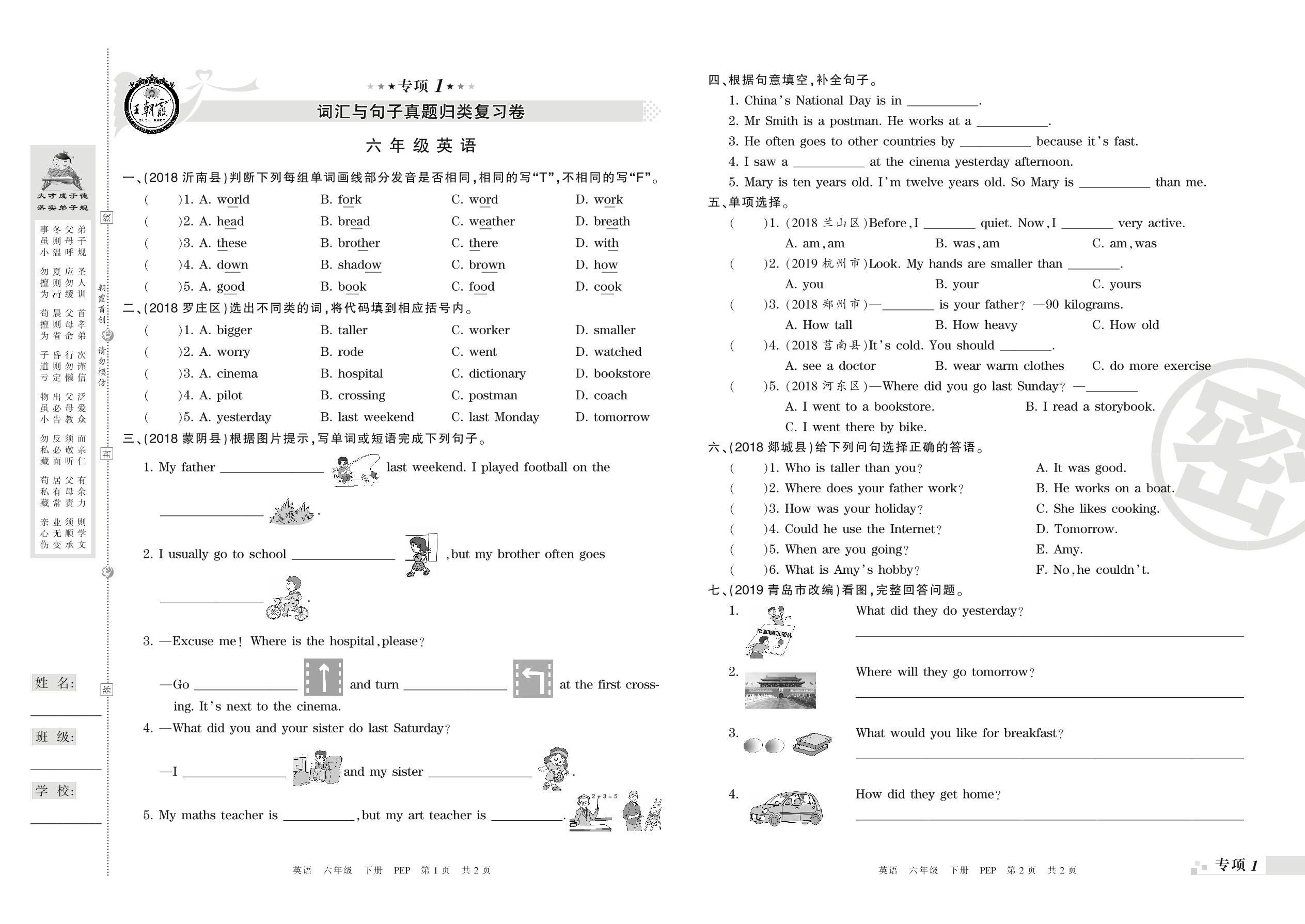 王朝霞期末专项卷——词汇与句子、阅读理解真题归类复习卷六年级下册英语(PEP版)_R210807162121【0】