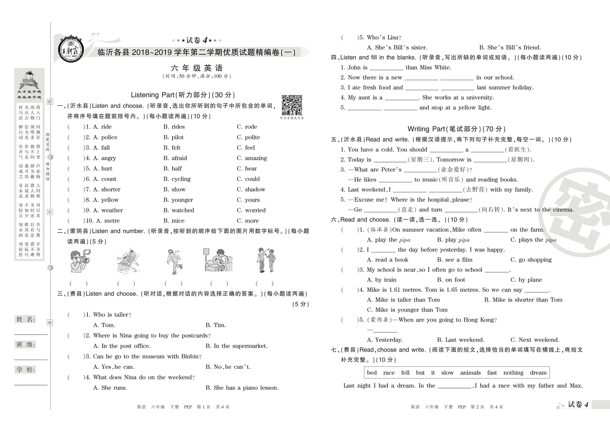 2018-2019学年第二学期临沂各县优质试题精编卷(一)六年级英语试卷(PEP版)【4】