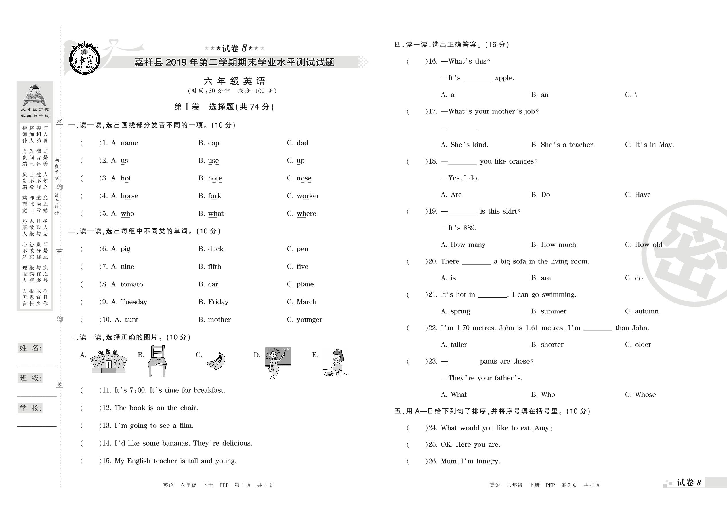 2018-2019学年第二学期济宁市嘉祥县六年级英语试卷(PEP版)【8】