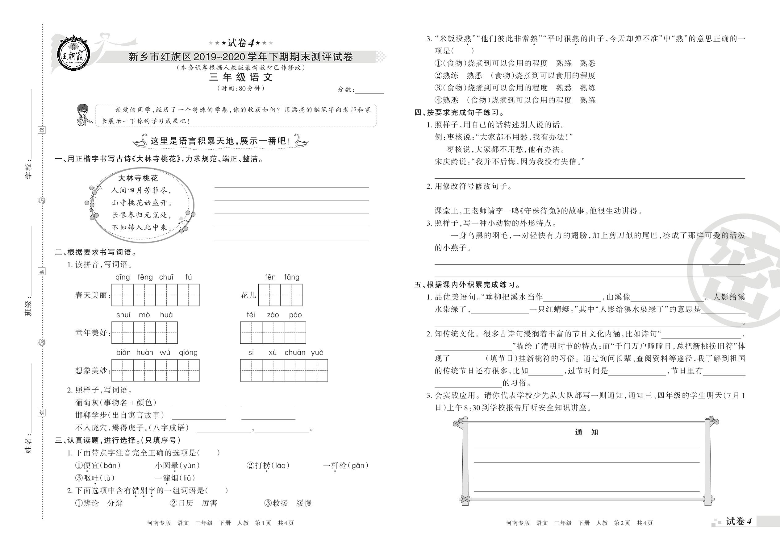 2019-2020学年第二学期新乡市红旗区三年级语文试卷(人教版)【4】