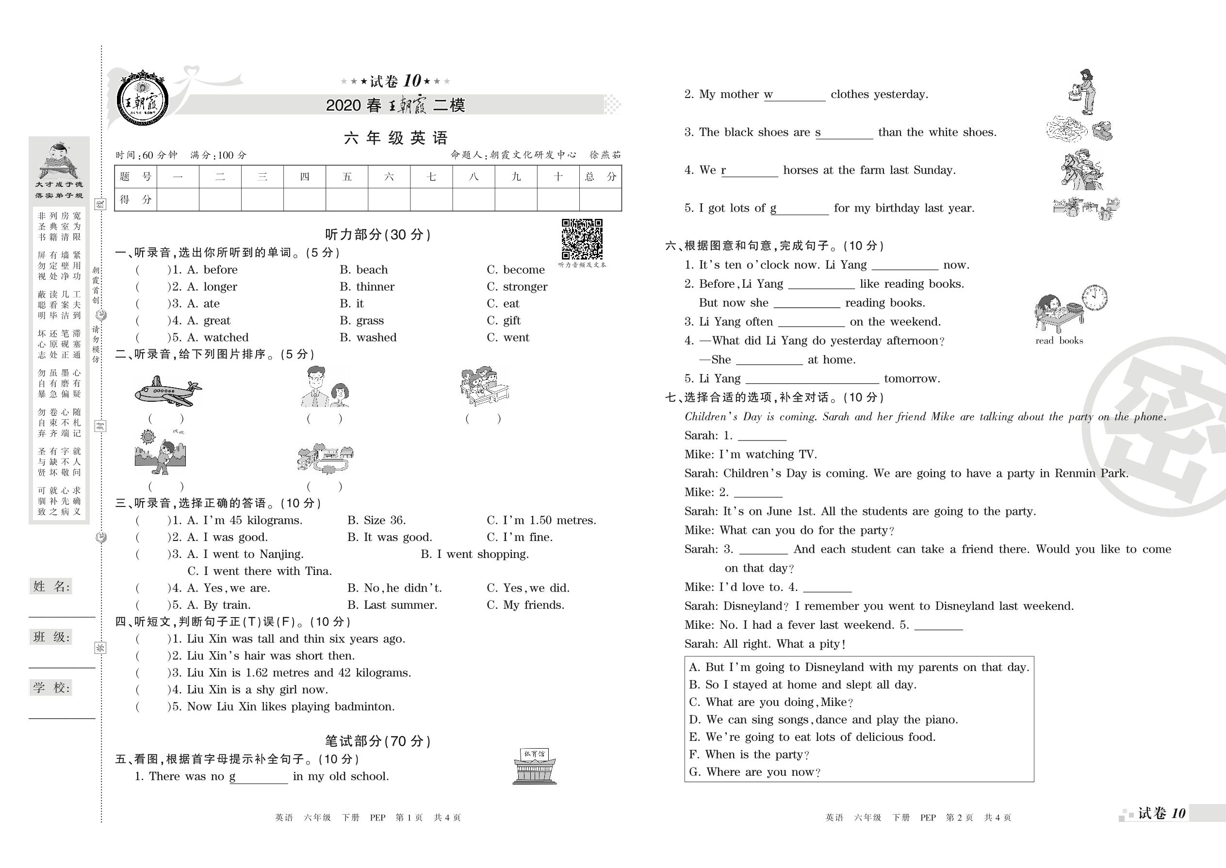 王朝霞期末模拟卷六年级下册英语(PEP版)_R210807162227【10】