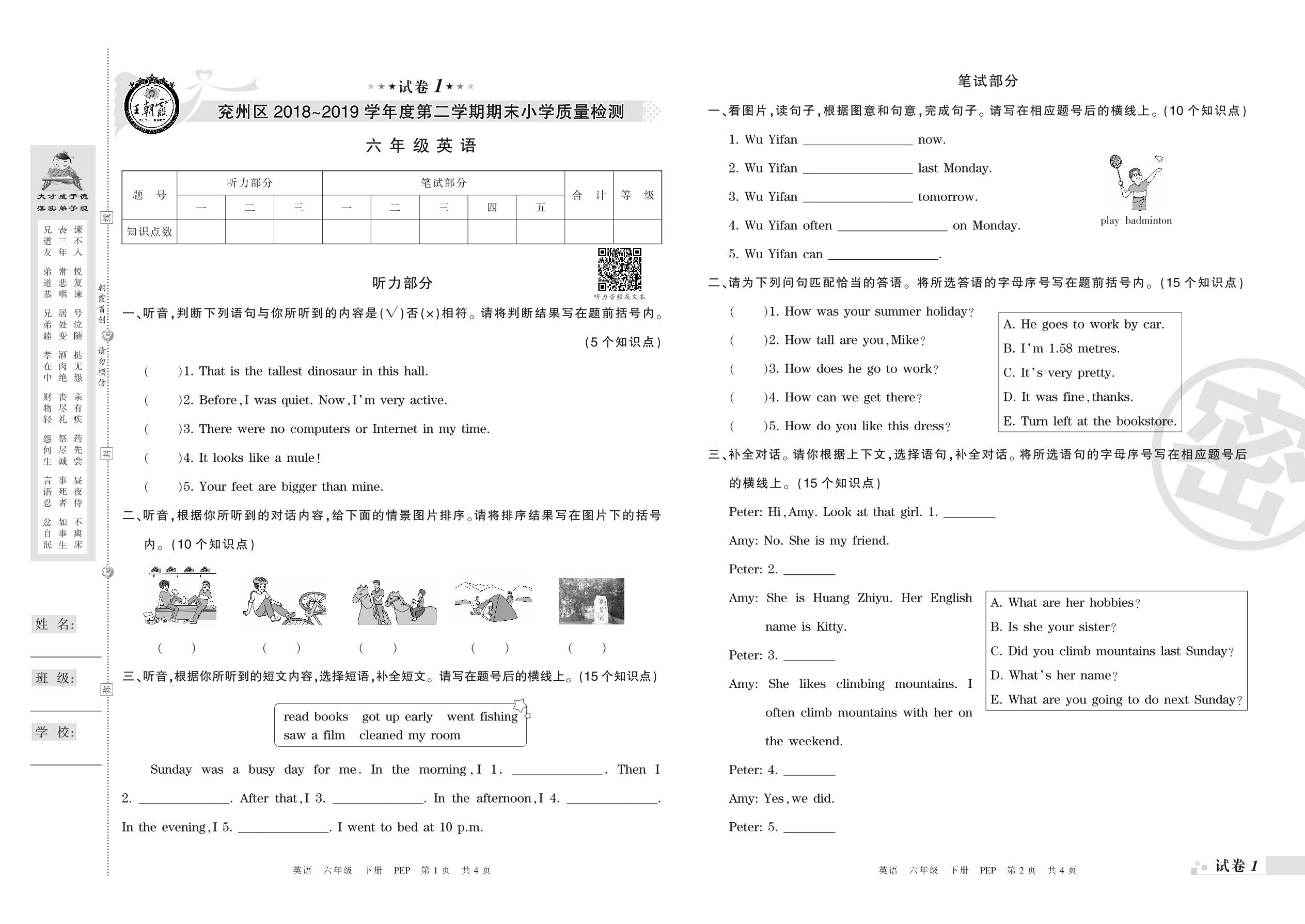2018-2019学年第二学期济宁市兖州区六年级英语试卷(PEP版)【1】