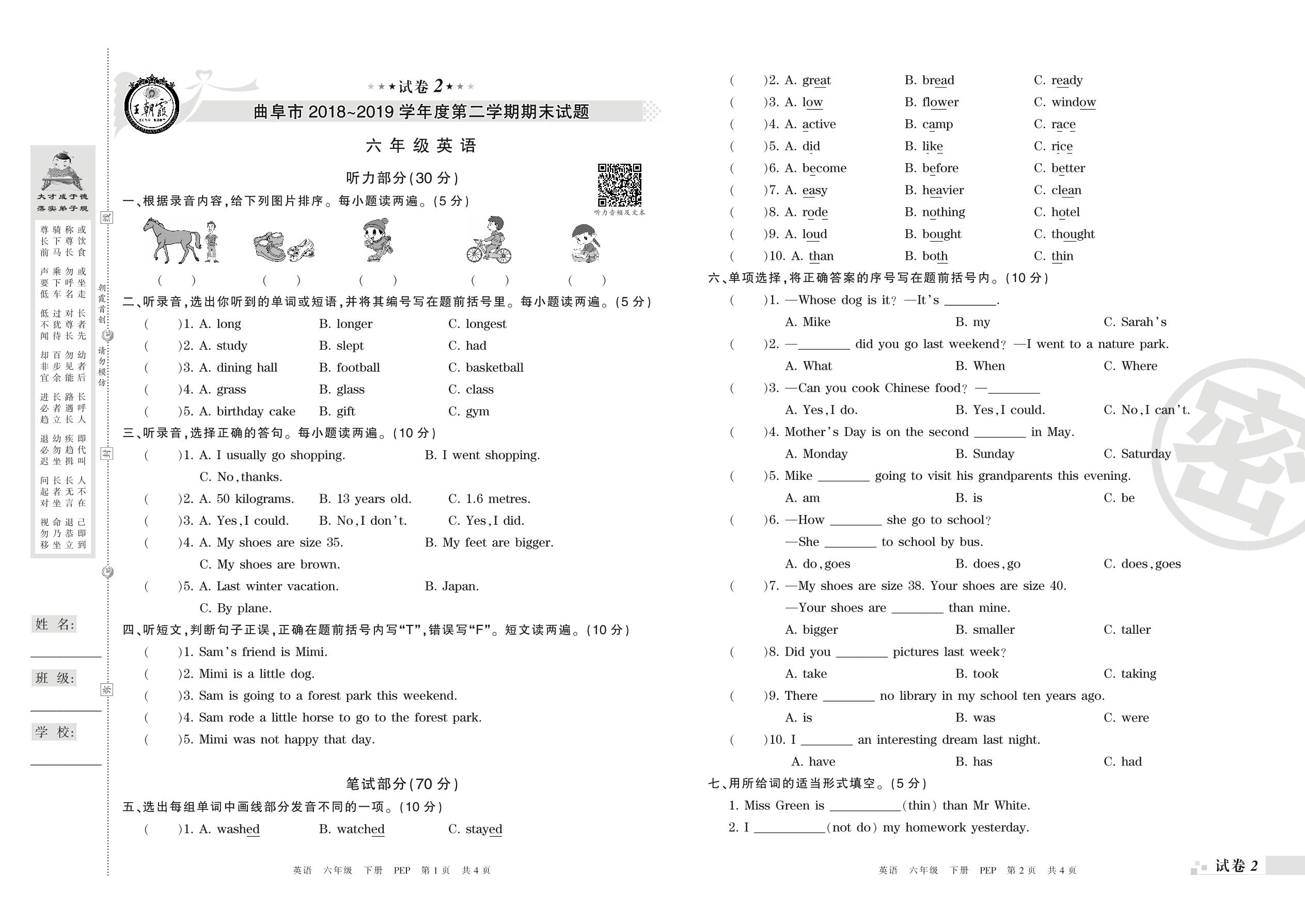 2018-2019学年第二学期曲阜市六年级英语试卷(PEP版)【2】