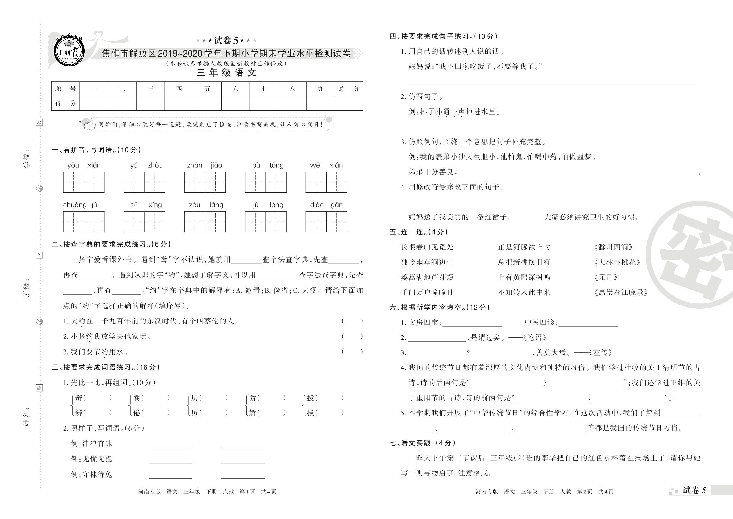 2019-2020学年第二学期焦作市解放区三年级语文试卷(人教版)【5】