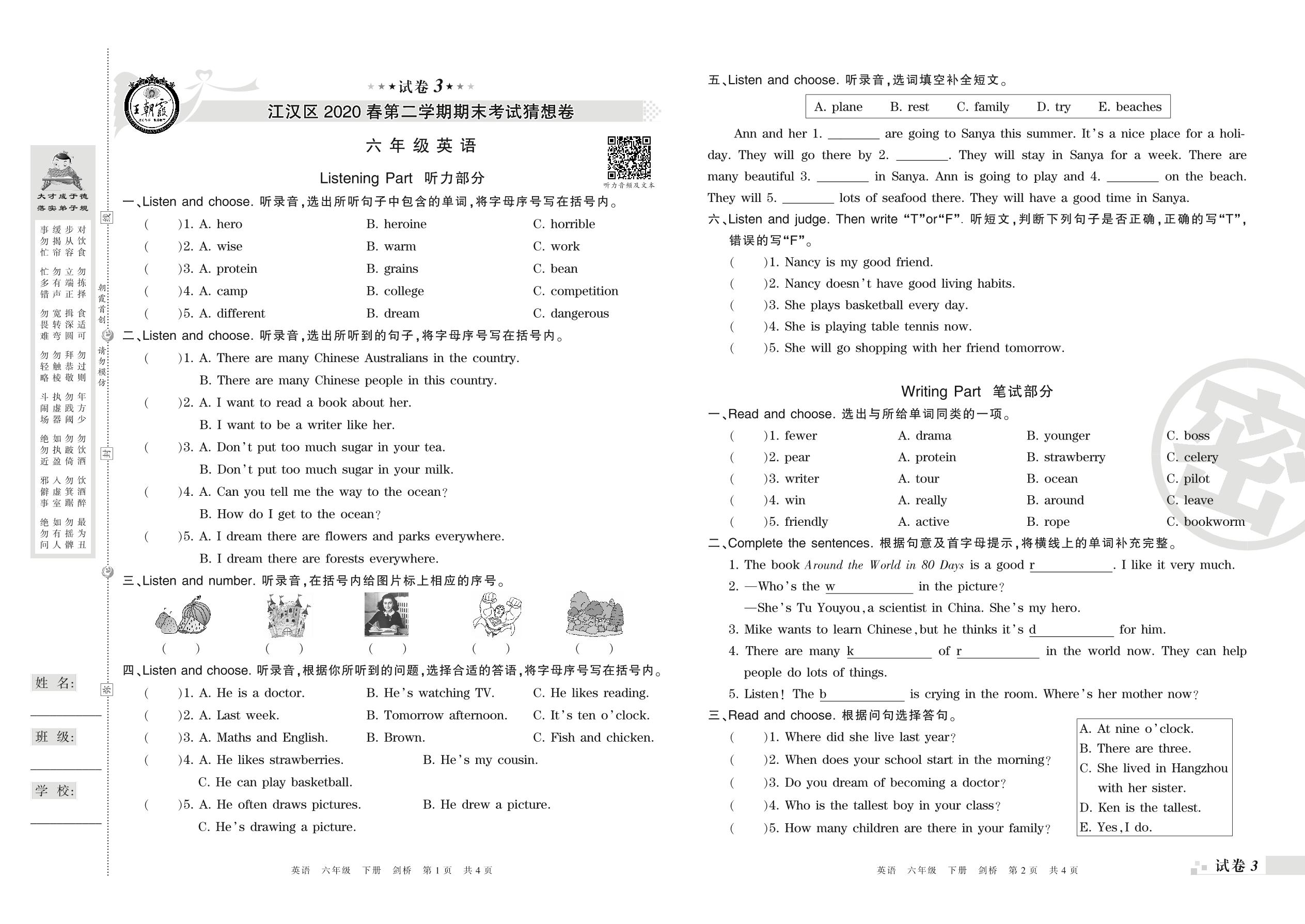2018-2019学年第二学期武汉市江汉区猜想卷六年级英语试卷(剑桥版)【3】