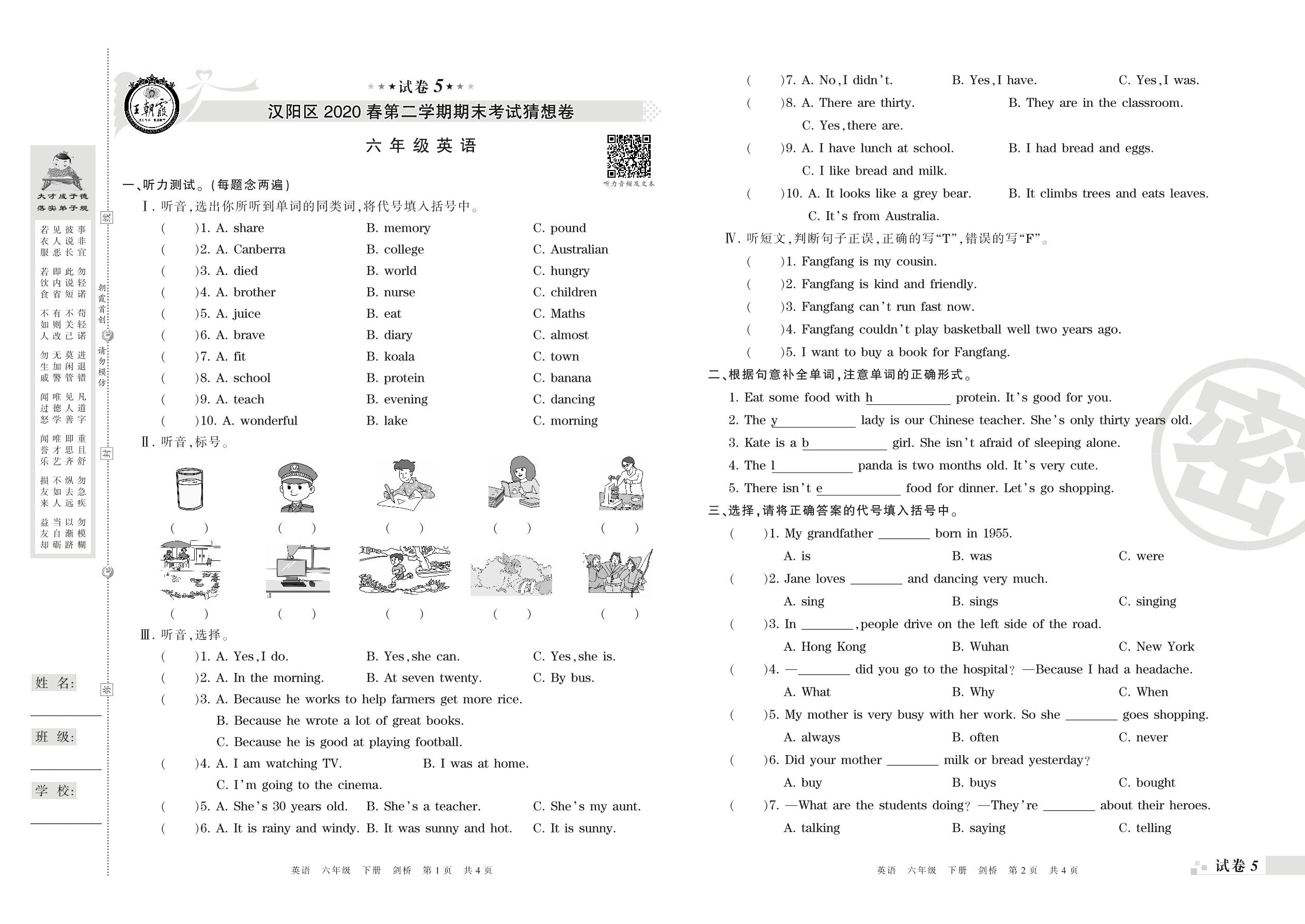 2018-2019学年第二学期武汉市汉阳区猜想卷六年级英语试卷(剑桥版)【5】