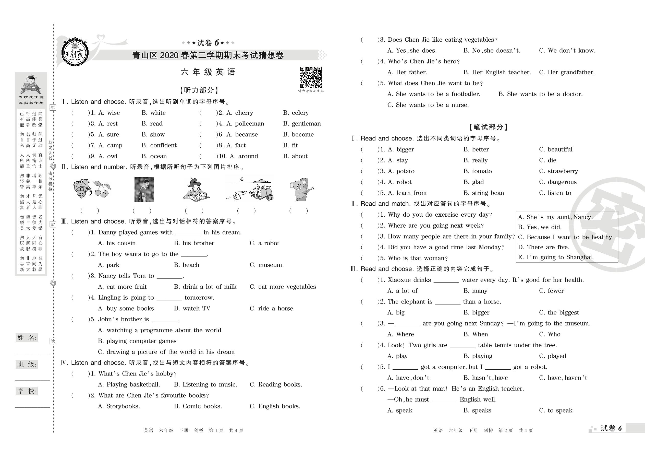 2018-2019学年第二学期武汉市青山区猜想卷六年级英语试卷(剑桥版)【6】