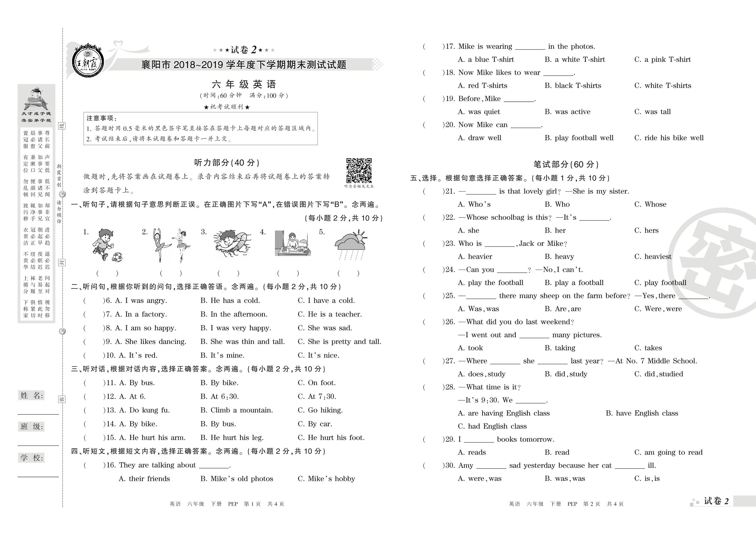 2018-2019学年第二学期襄阳市六年级英语试卷(PEP版)【2】