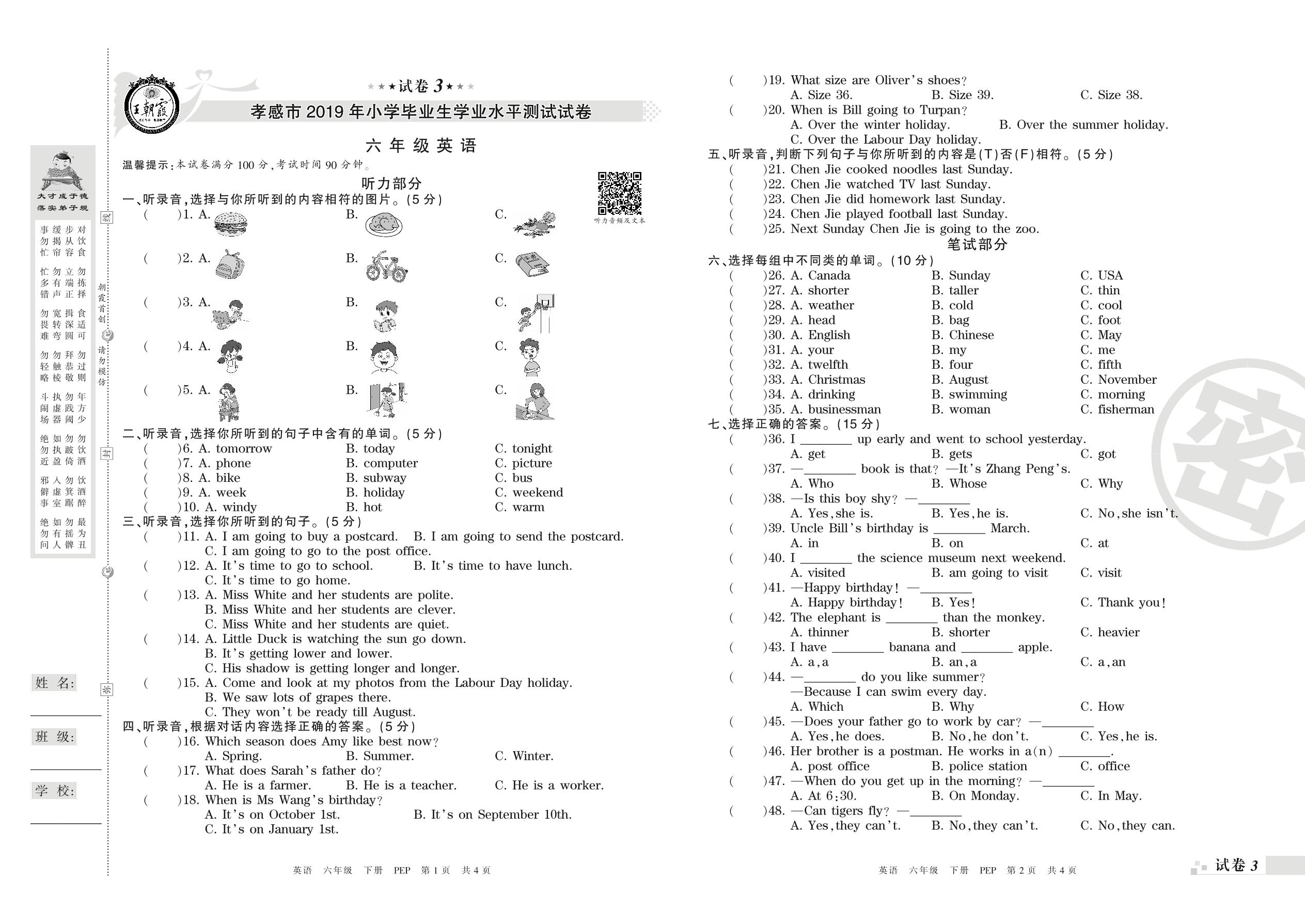 2018-2019学年第二学期孝感市六年级英语试卷(PEP版)【3】