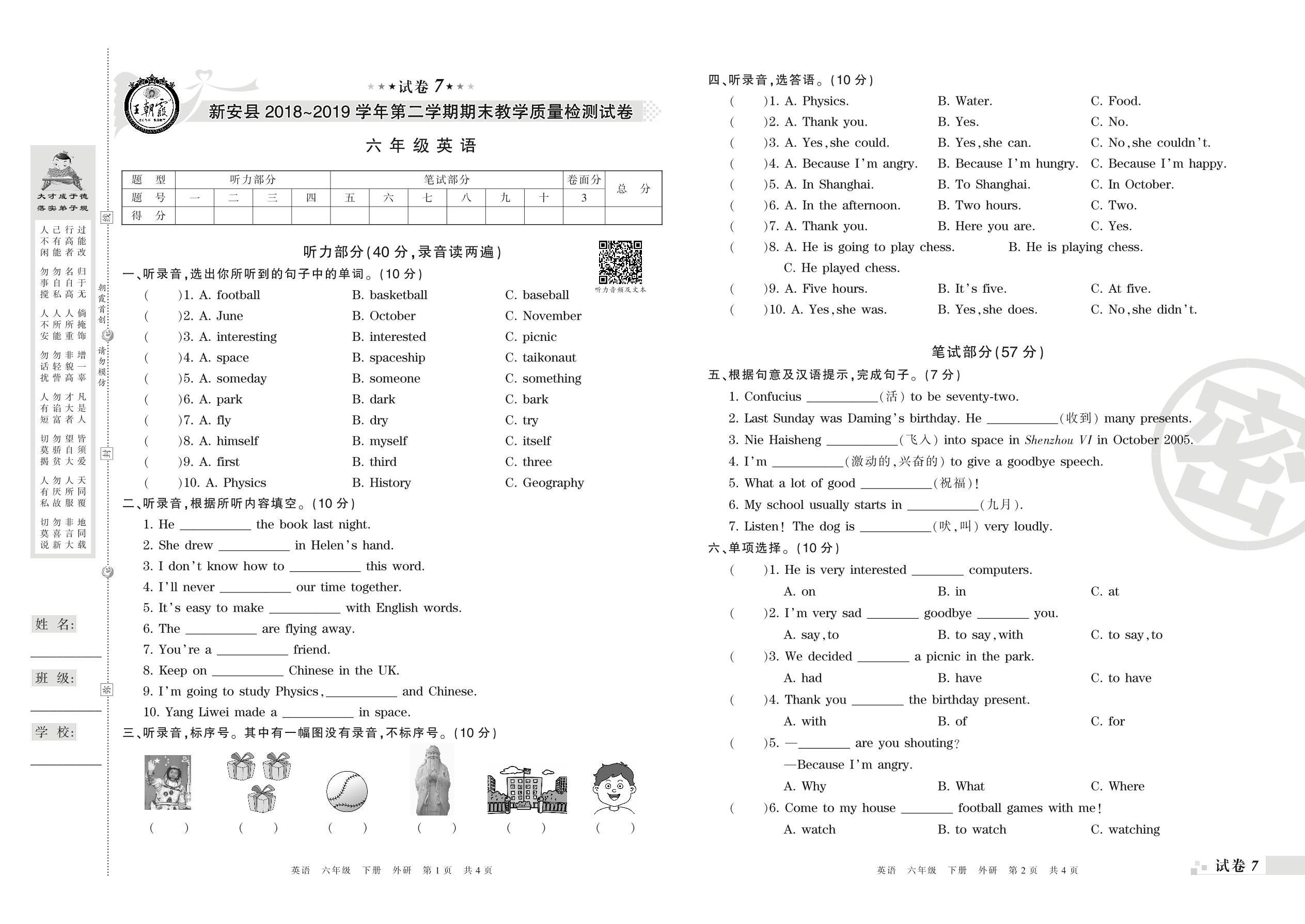 2018-2019学年第二学期洛阳市新安县六年级英语试卷(外研版)【7】