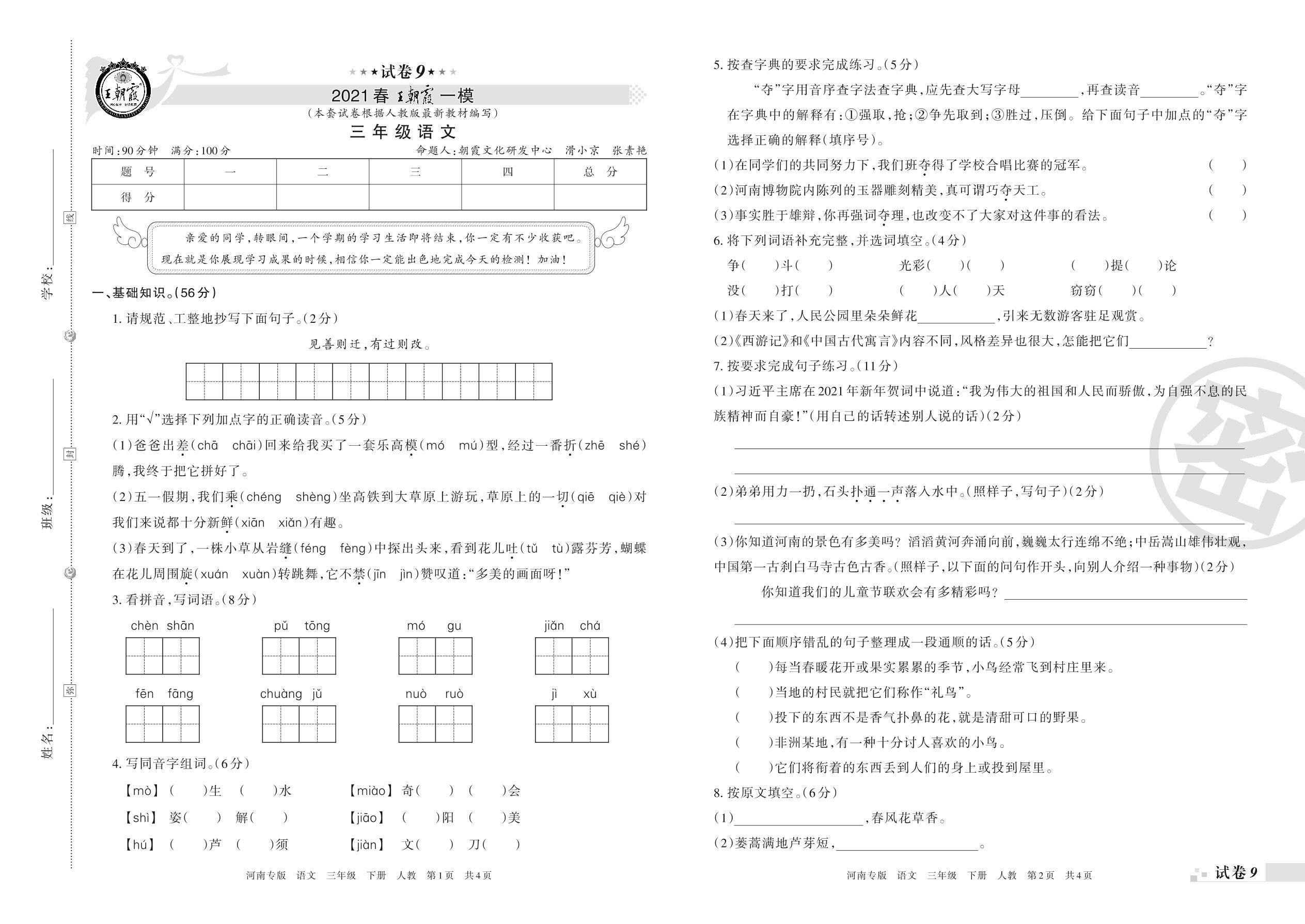 王朝霞期末模拟卷三年级下册语文(人教版)_R21080183941【9】