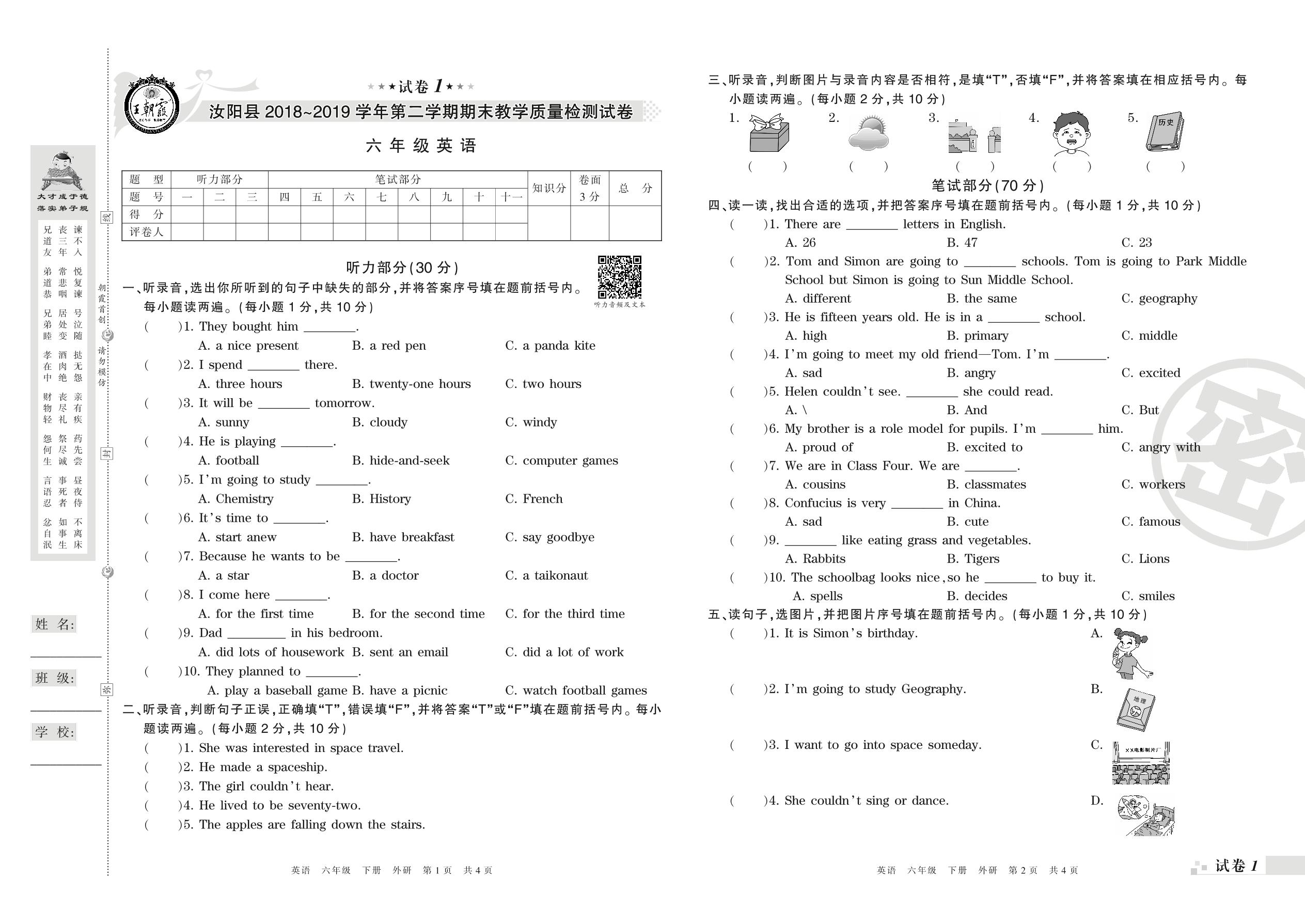 2018-2019学年第二学期洛阳市汝阳县六年级英语试卷(外研版)【1】