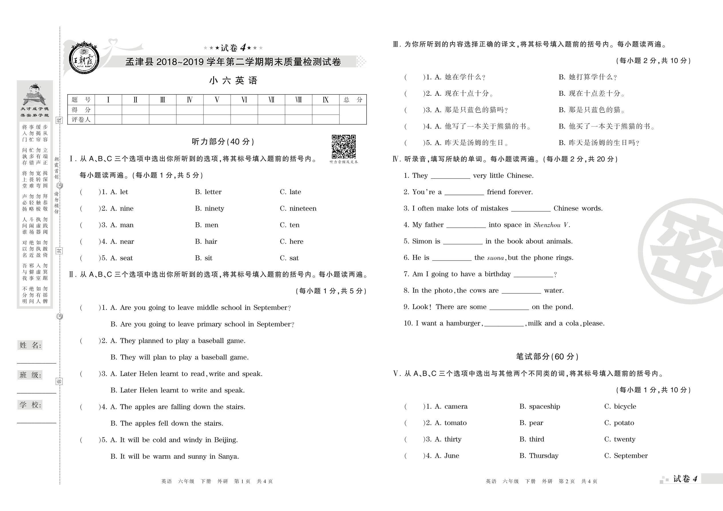 2018-2019学年第二学期洛阳市孟津县六年级英语试卷(外研版)【4】