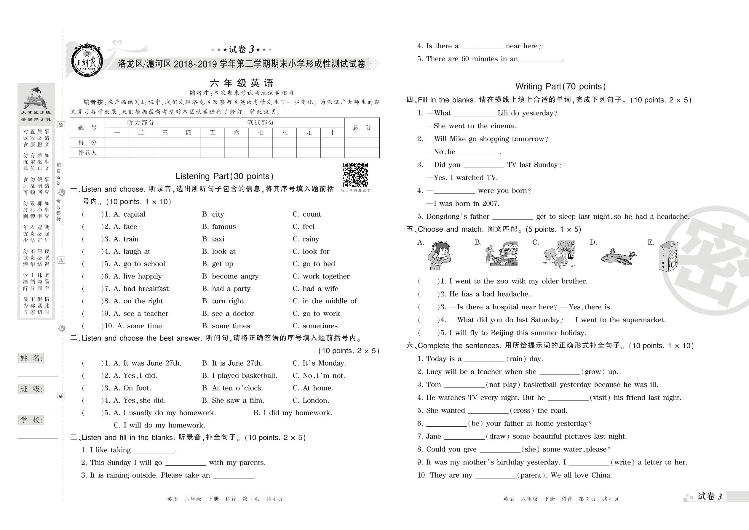 2018-2019学年第二学期洛阳市洛龙区、瀍河区六年级英语试卷(科普版)【3】