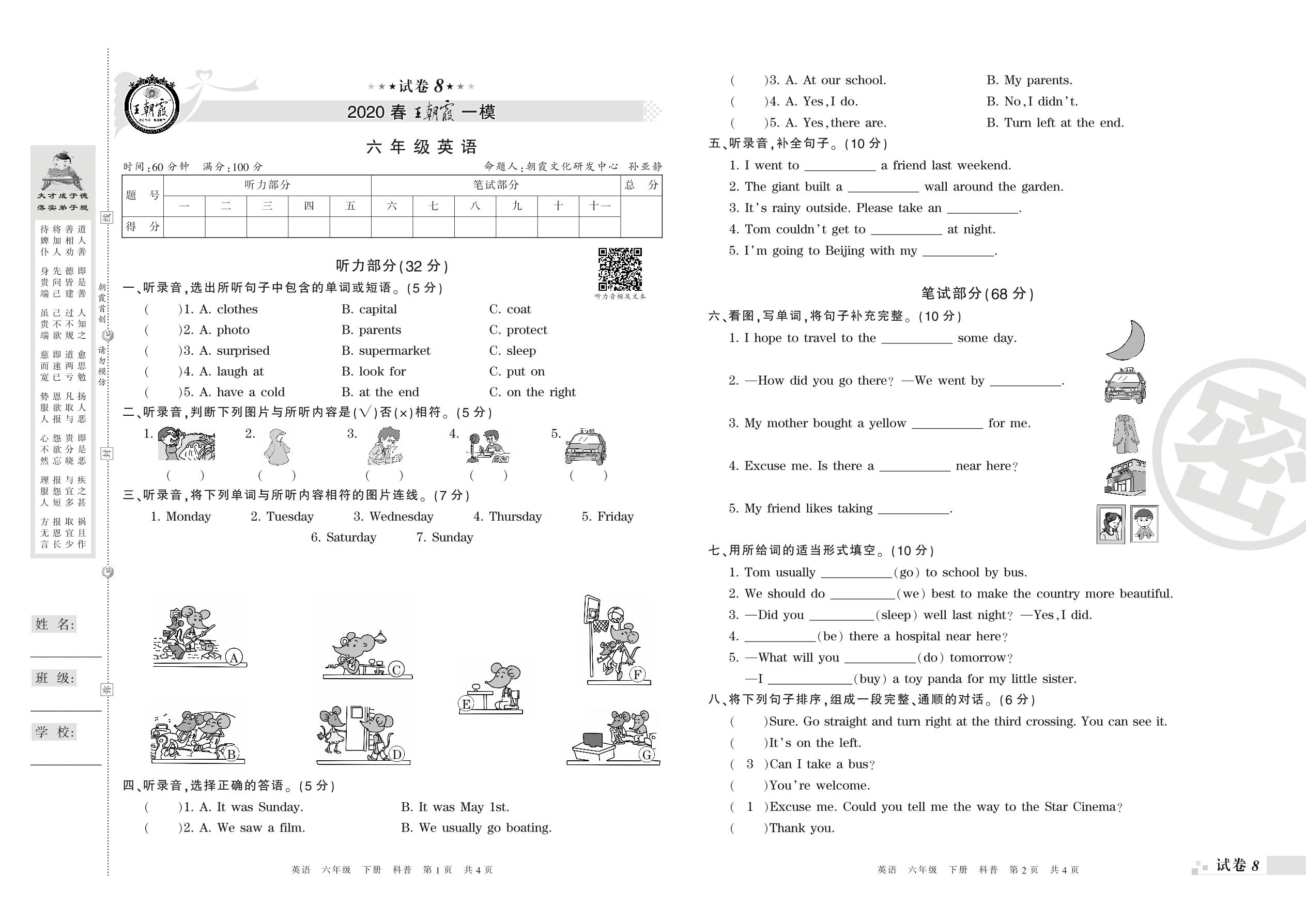 王朝霞期末模拟卷六年级下册英语(科普版)_R210807162921【8】