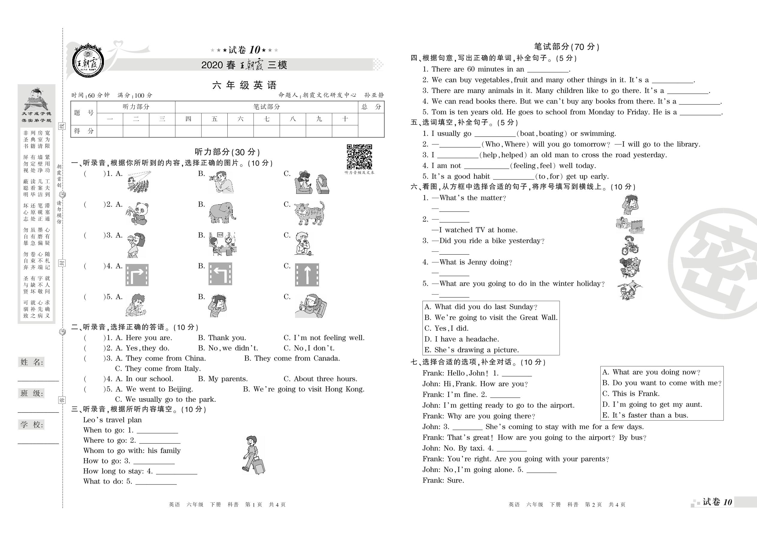 王朝霞期末模拟卷六年级下册英语(科普版)_R210807162938【10】