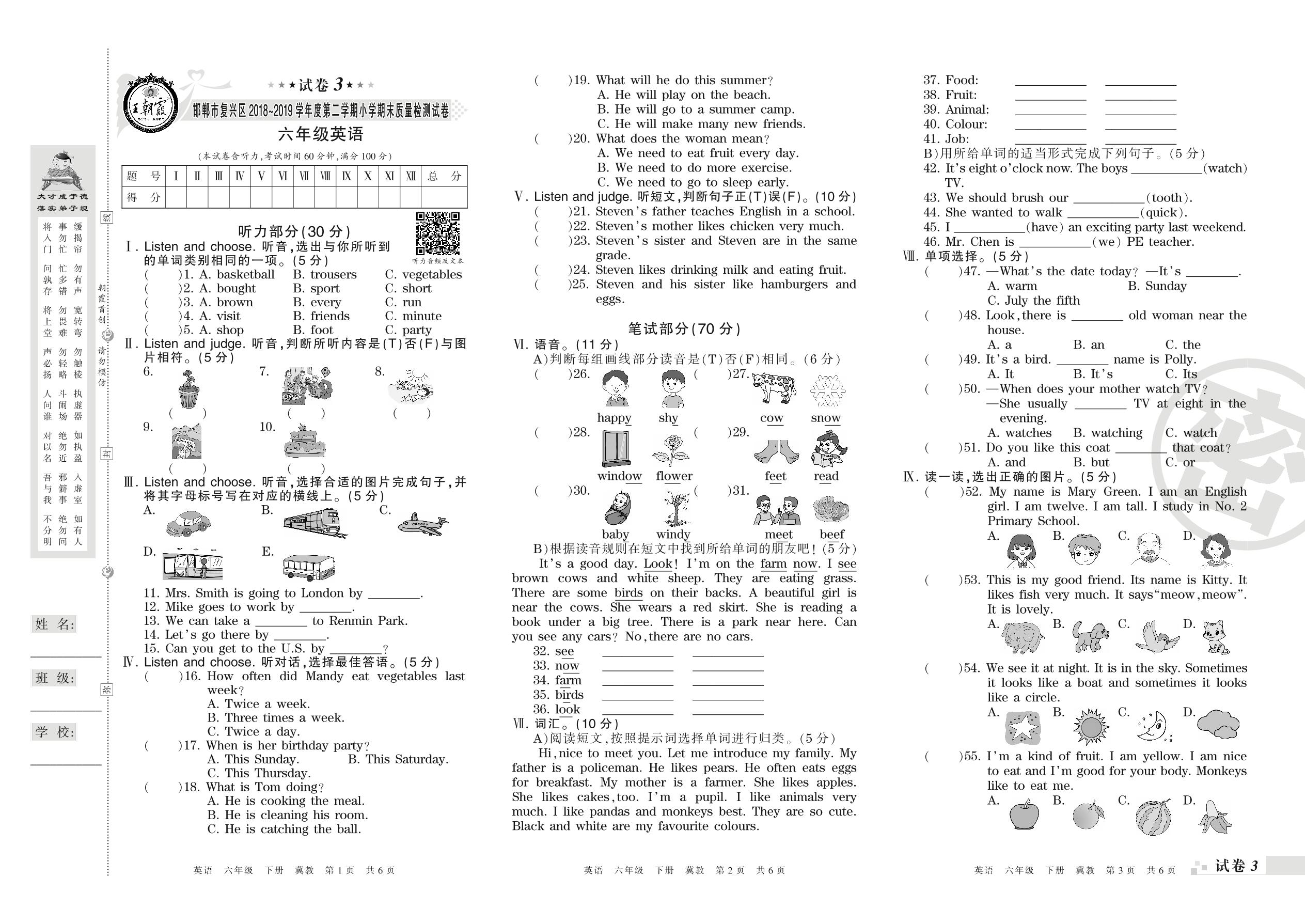2018-2019学年第二学期邯郸市复兴区六年级英语试卷(冀教版)【3】