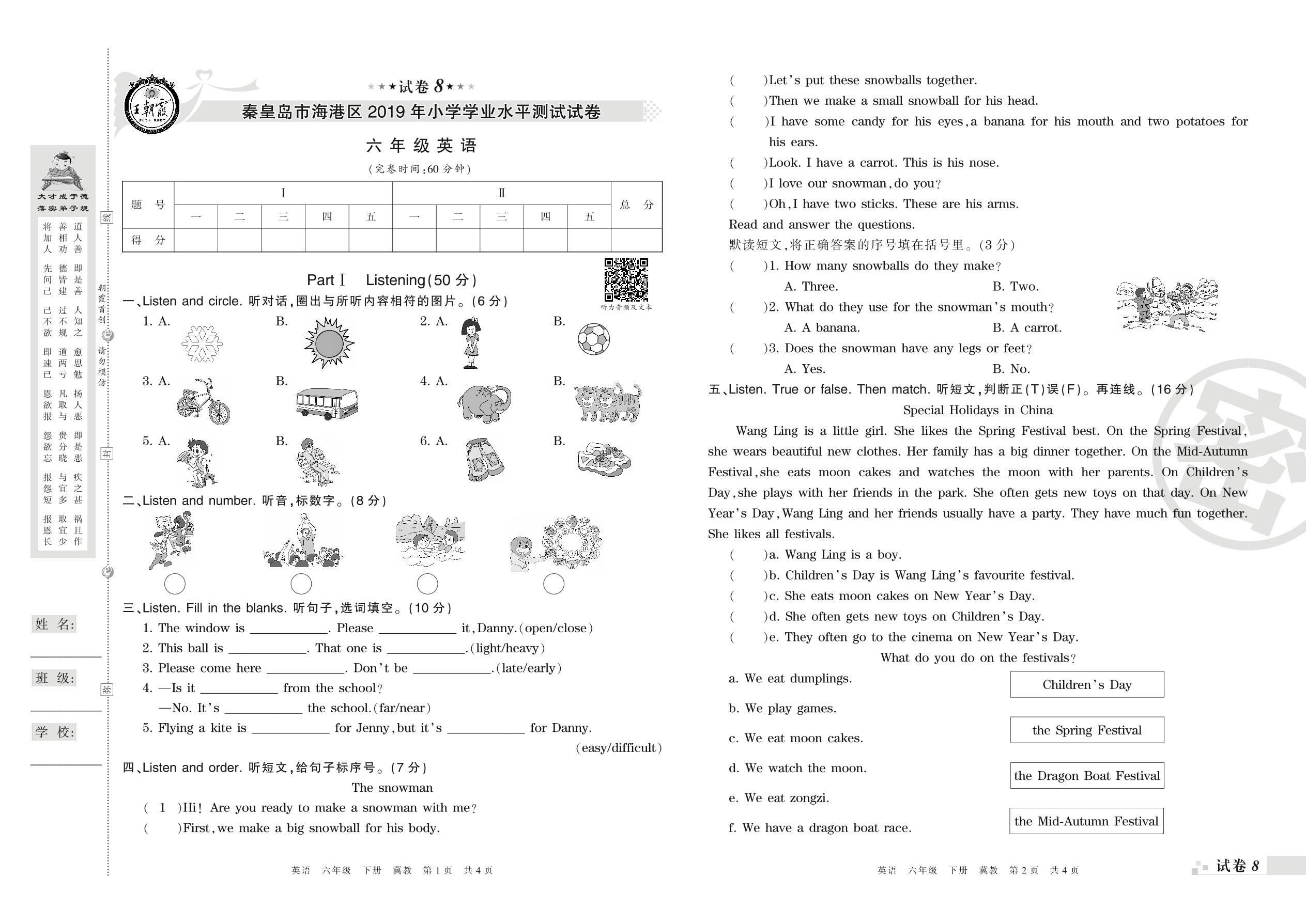 2018-2019学年第二学期秦皇岛市海港区六年级英语试卷(冀教版)【8】