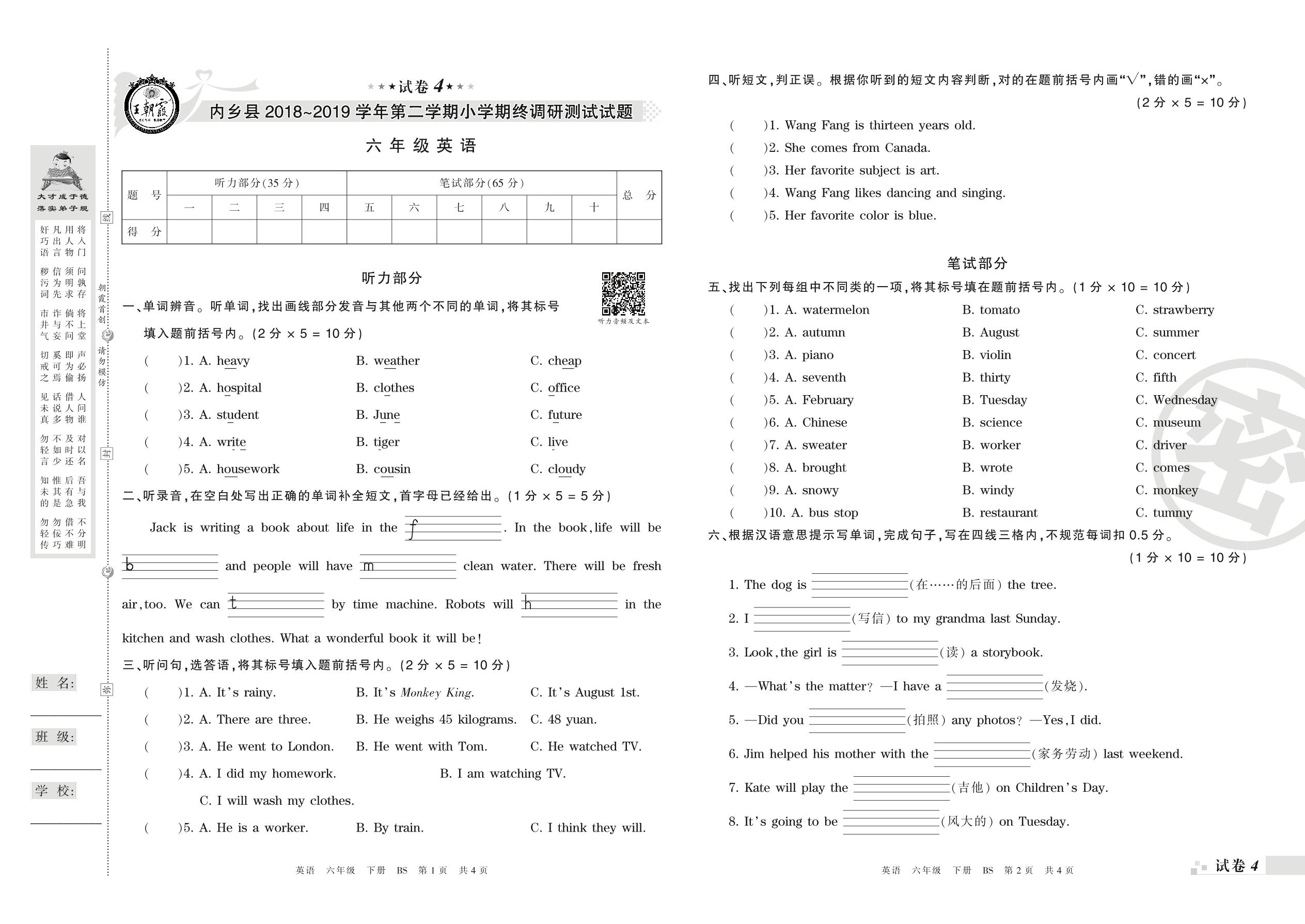 2018-2019学年第二学期南阳市内乡县六年级英语试卷(北师版)【4】
